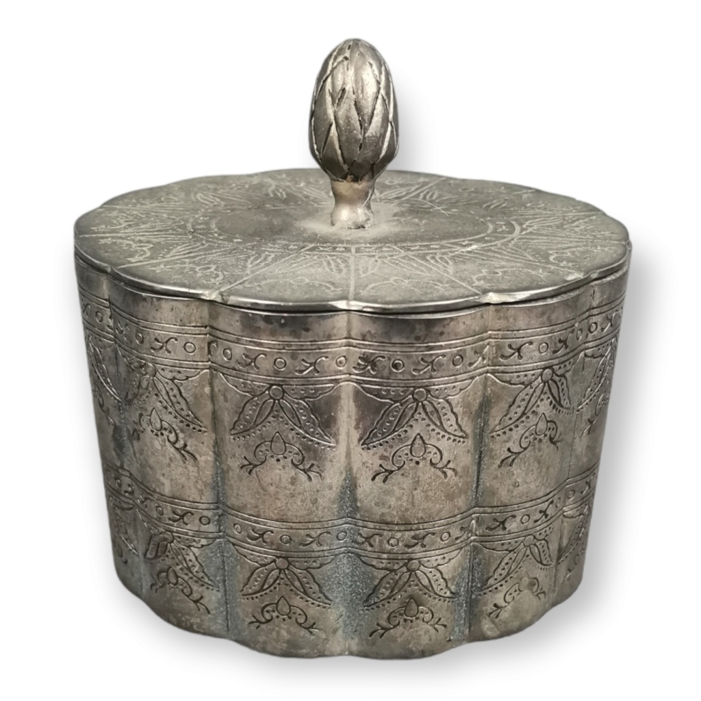 Email € 10 Estanho. Corpo lobulado com decoração cinzelada.Dim: 11,5 X 11,5 cm. € 10Licitar Solicitar informação adicional Voltar a: Leilão 406 - Coleccionismo e Livros Estanho. Corpo lobulado com decoração cinzelada.Dim: 11,5 X 11,5 cm. € 10Licitar