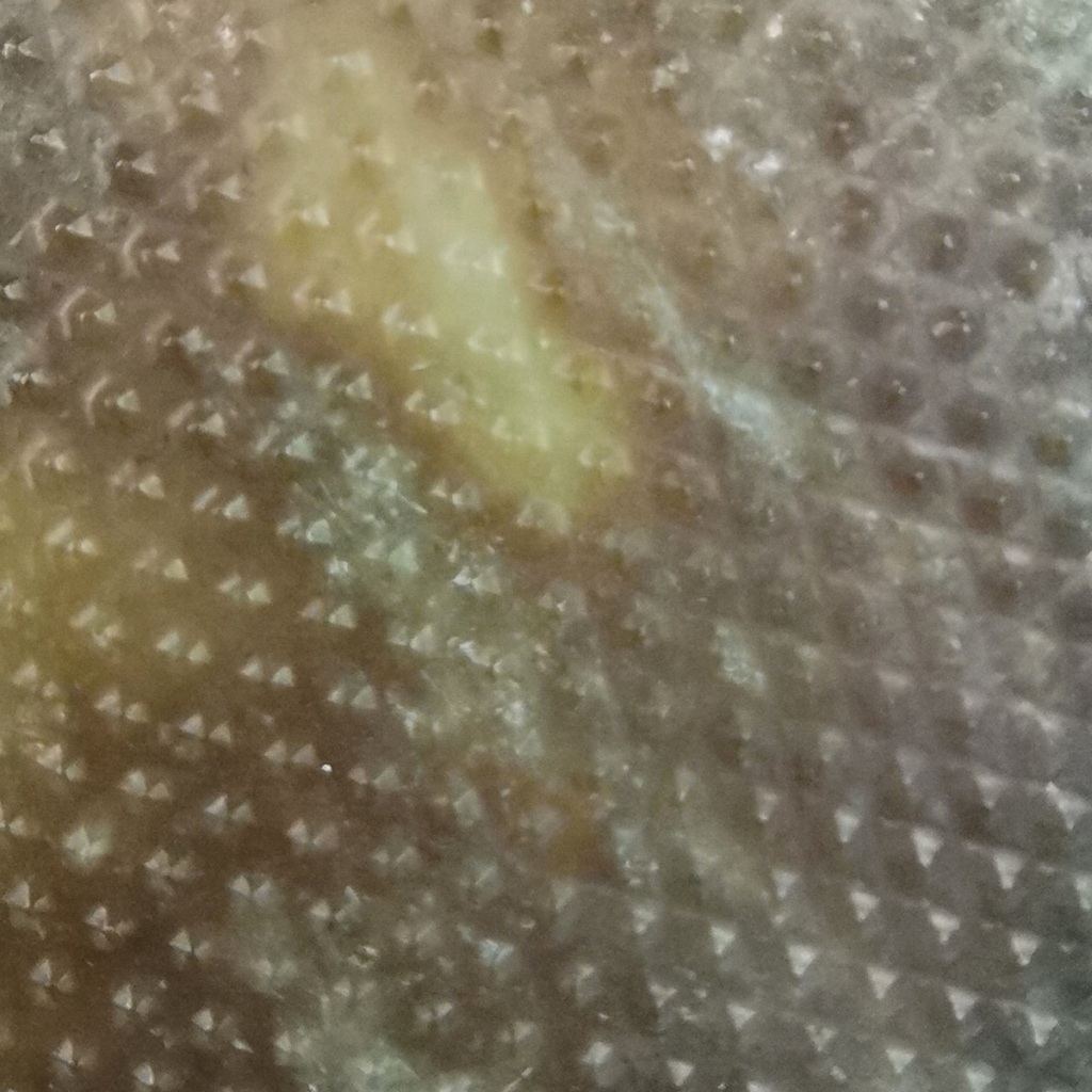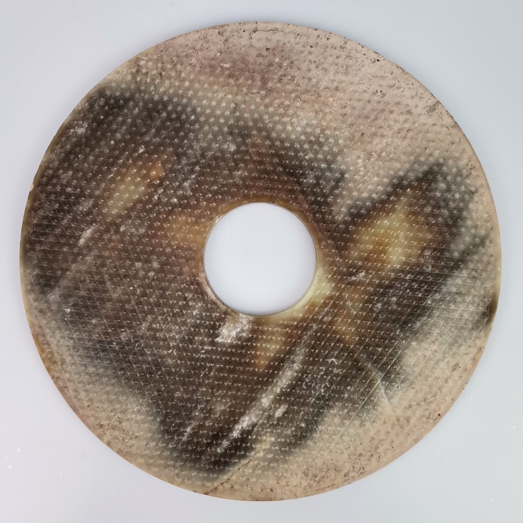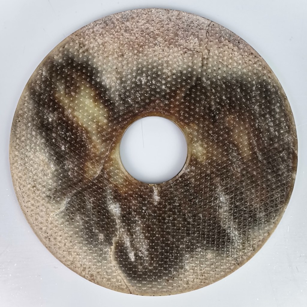 Disco de origem Chinesa em jade. Ambas as faces esculpidas em baixo relevo com pequenas saliências. Furo central com 4,5 cm. Sinais de uso. Dim: 19 cm. Espessura: 5 mm.