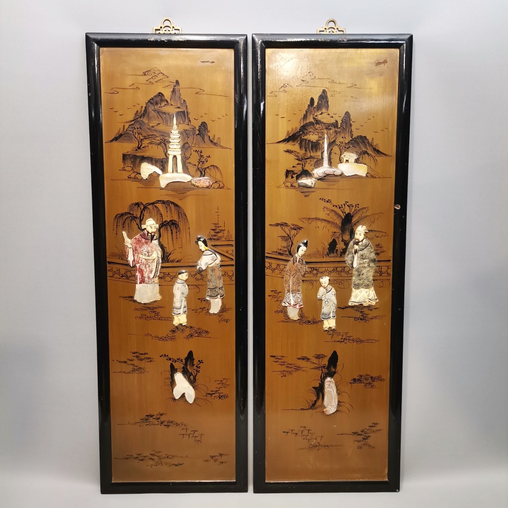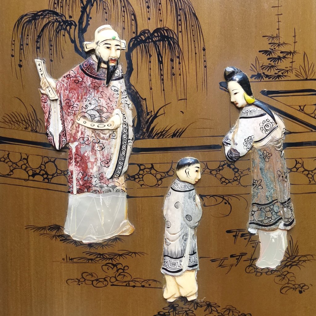 Madeira dorada com decoração relevada em osso e madre pérola. Molduras lacadas a negro com ferragens em bronze. Falhas no lacado das molduras. China séc XX. Dim: 91 X 30,5 cm.