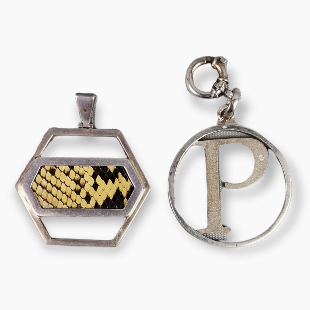 Prata sem marcas, ao abrigo do Decreto-Lei 120/2017, de 15 de Setembro - art. 2º, n.º 2, alínea c). Um com aplicação em pele de cobra. Peso: 32,2 grs. Dim (maior): 4,5 cm.