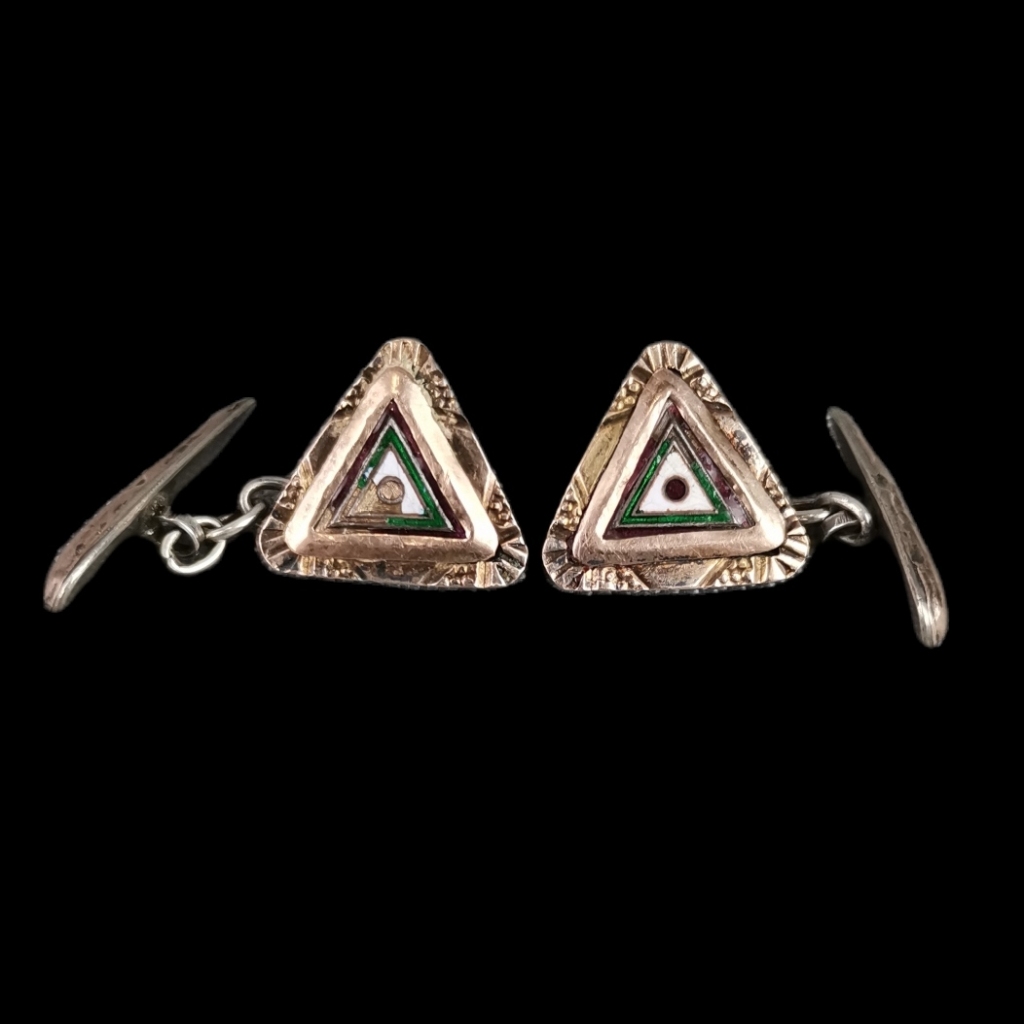 Prata e esmalte. Formato triangular. Possivelmente Maçónicos. Defeitos no esmalte. Sem marcas, ao abrigo do Decreto-Lei 120/2017, de 15 de Setembro - art. 2º, n.º 2, alínea c). Peso 5,24 grs. Dim.1,5 cm.