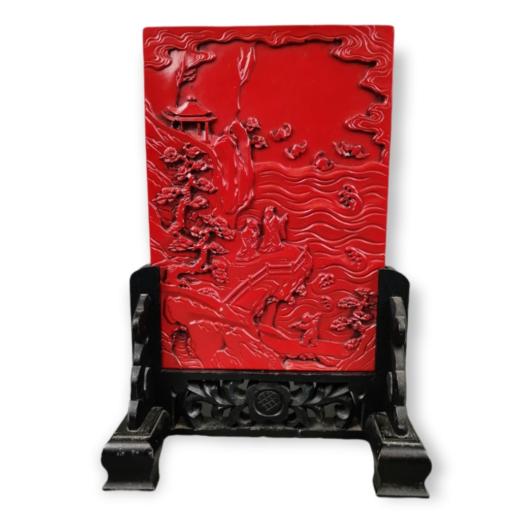 Ecrã Chinês em laca Cinnabar. Decoração com paisagem e figuras orientais. Base em madeira entalhada. Dim (a placa): 20,5 X 14,5 cm. Total: 26,5 X 18,5 cm.