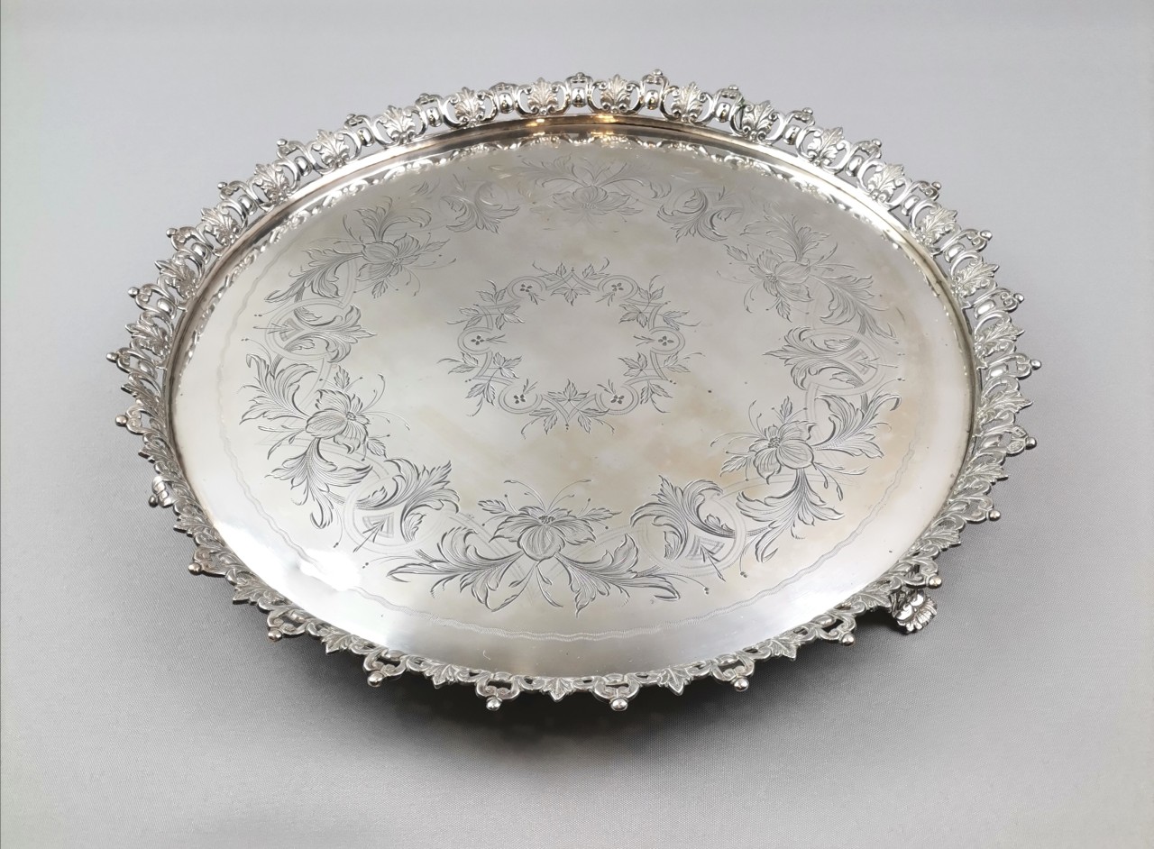 Prata Portuguesa. Contraste do ensaiador do Porto José Rodrigues Teixeira (1877-1881) e marca de ourives MJM não identificado (1870-1881). Cinzelada com flores. Peso: 1155 grs. Diam: 36,5 cm.