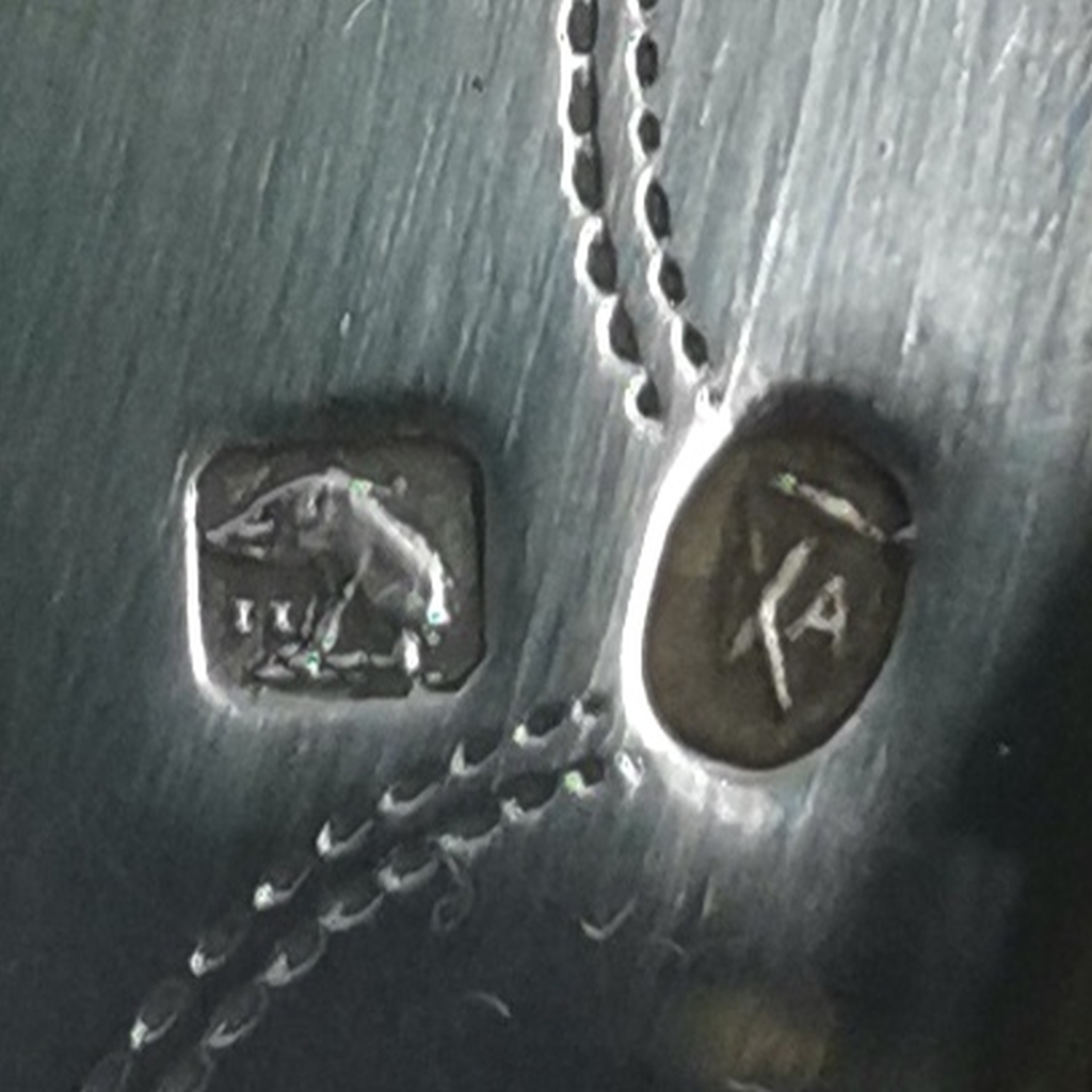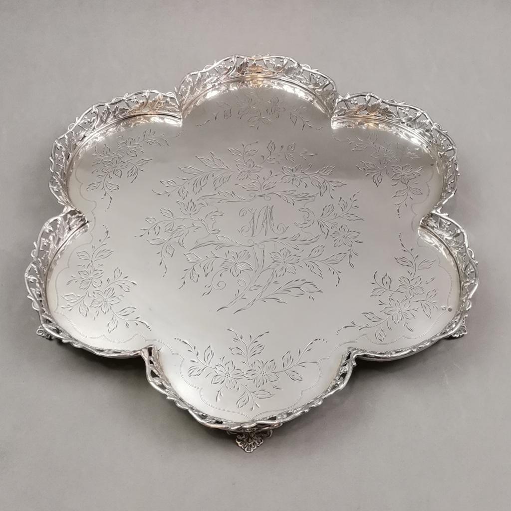Salva lobolada em prata Portuguesa de 833/1000. Marca de contraste do Porto, Javali II título. Marca de ourives não identificada. Gradinha decorada com pássaros e folhagem. Centro cinzelado com flores e monograma. Peso: 770 grs.