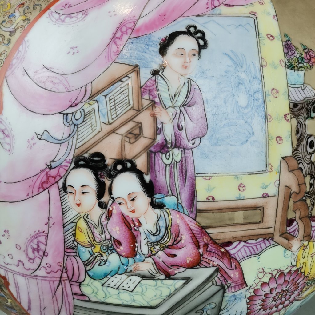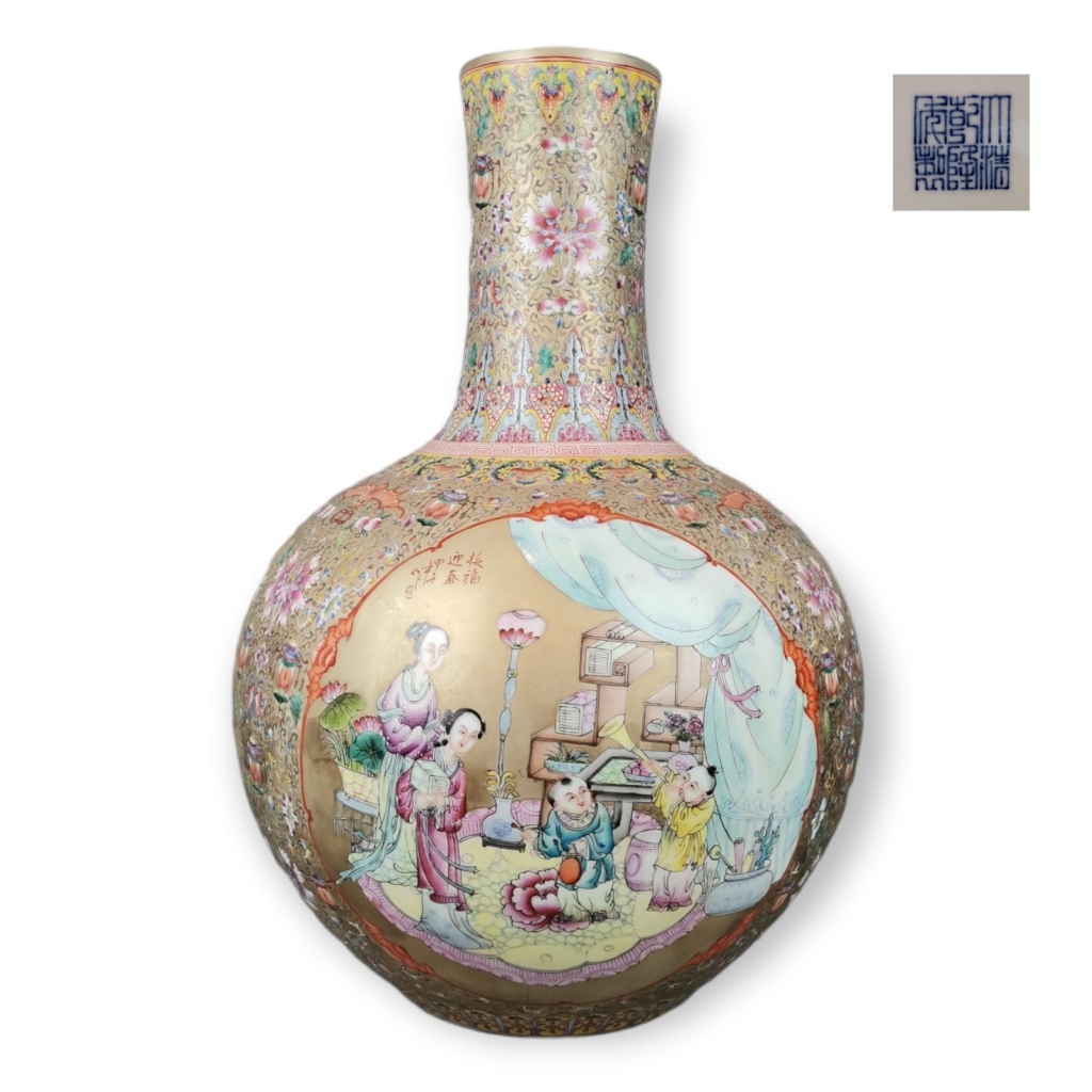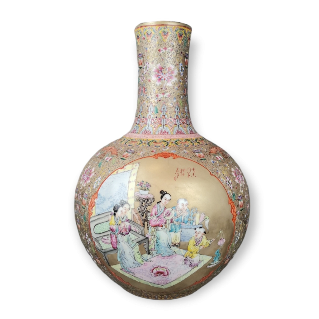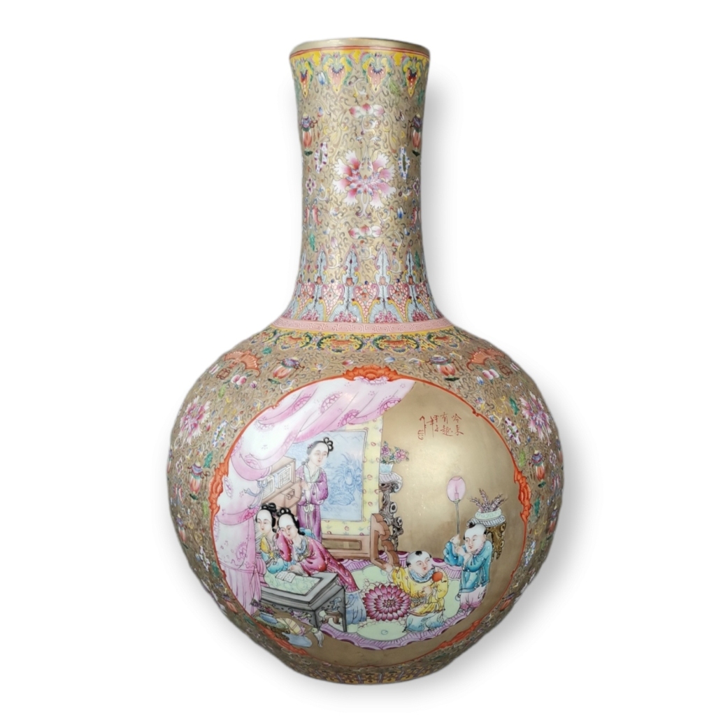 China séc XIX. Decoração a esmaltes polícromos e ouro, reservas com figuras e flores dita mandarim. Fundo com flores, morcegos e objectos auspiciosos. Marca apócrifa Qianlong. Pequeno restauro no bocal. Dim. 54 X 35 cm