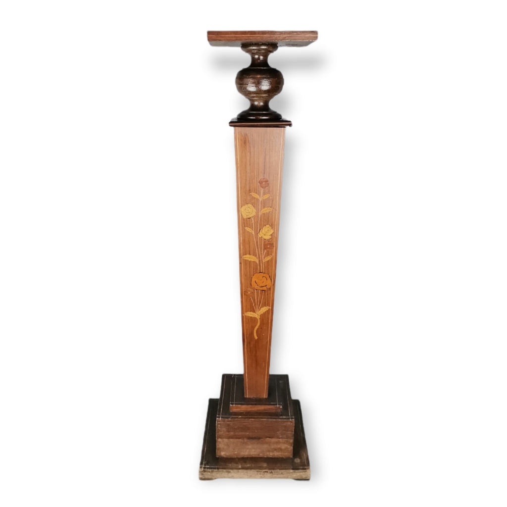 Pau santo com embutidos em buxo. Corpo tronco piramidal e base quadrangular. Topo com elemento torneado com vestigios de xilófagos. Defeitos. Dim. 111 X 29 cm.