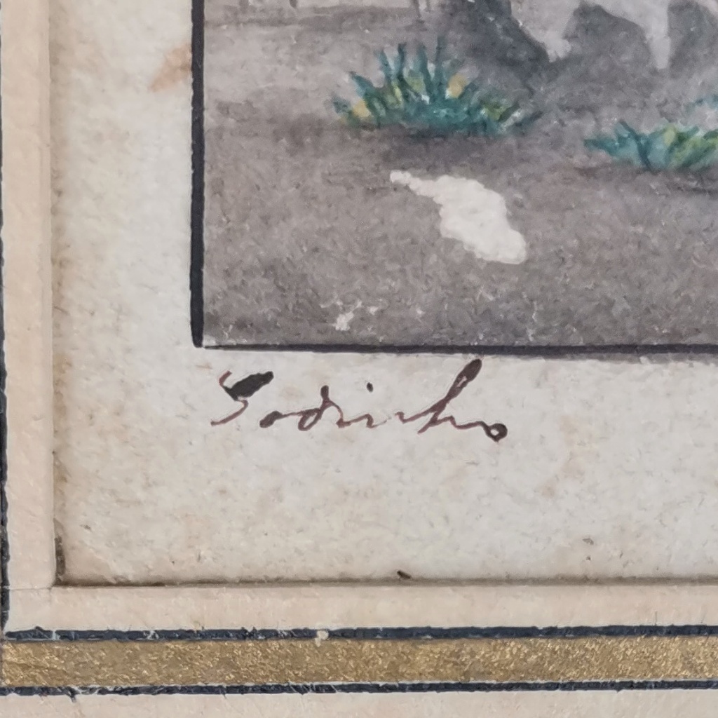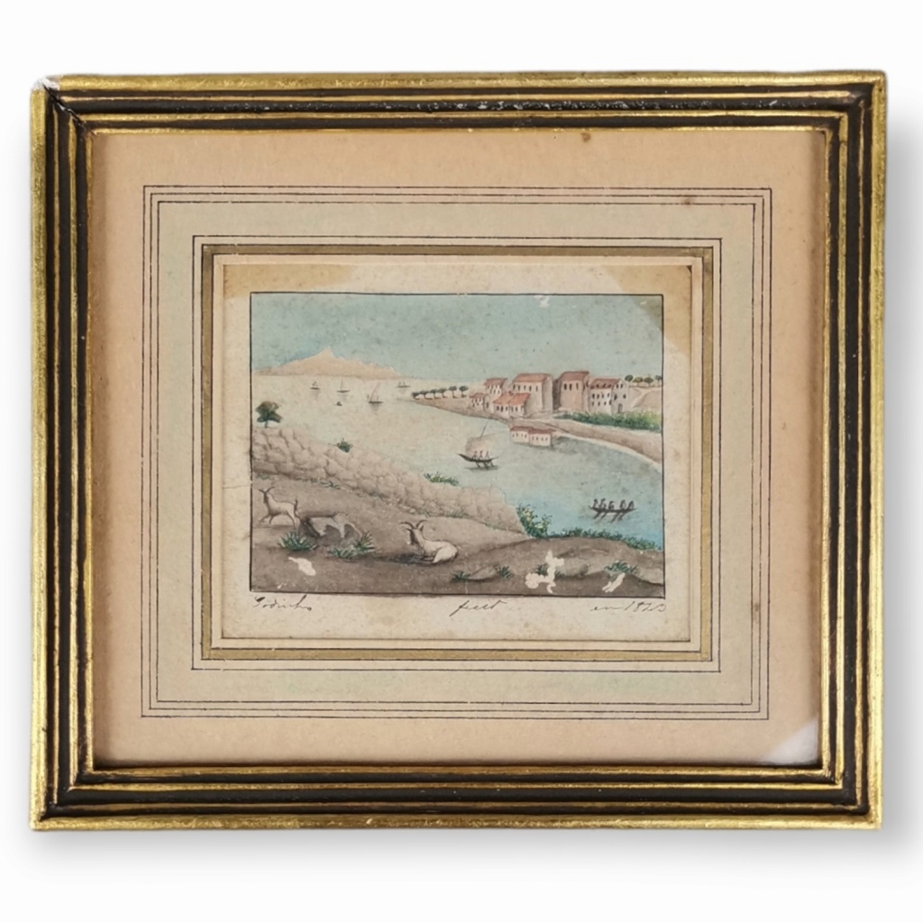 Aguarela s/ papel. Paisagem fluvial com casario e animais. Moldura dourada com passpartout. Faltas e defeitos. Assinado e datado Bernardo Godinho 1820. Dim. 5,3 X 7,3 cm. Total com moldura. 13,5 X 15 cm.