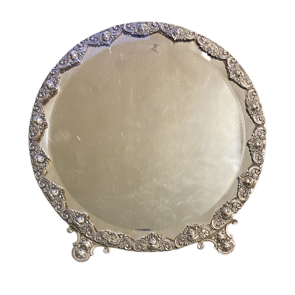 Moldura em prata Portuguesa de 833/1000, contraste Aguia (1938-1985), (833/000). Chapa de espelho biselada. Pequenas faltas. Diâm. 27,5 cm. Peso total 1030 grs.