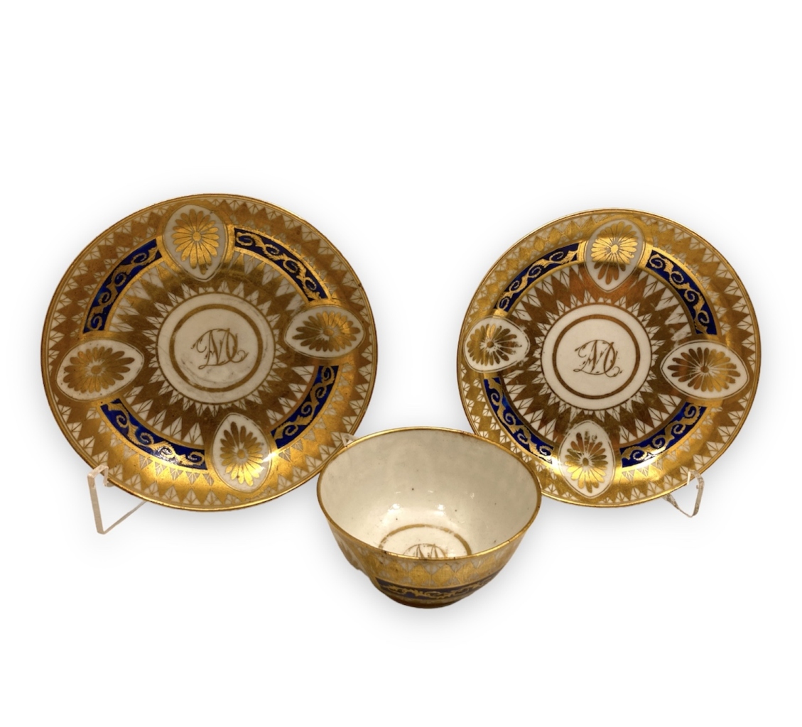 Porcelana chinesa de exportação decoração a azul e dourado com monograma "DM". Reinado Jiaqing (1796-1820). Sinais de uso, desgastes na decoração, cabelos. Diâm. Pires: 14cm.