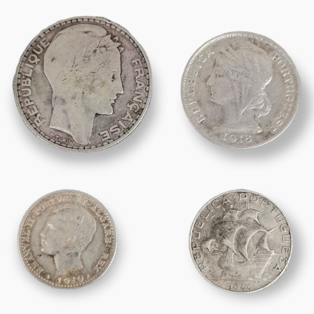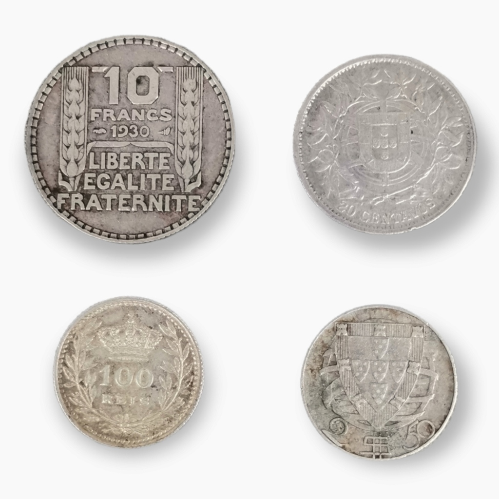 !0 francos Franceses de 1930. Prata 680/1000 Peso 10 grs. 20 centavos 1916. Prata de 835/1000. Peso 5grs. 2$50 de 1954. Prata de 650/1000. Peso 3,5 grs.Dim 2 cm. 100 Reis de D. Manuel 1910. Prata de 835/1000. Peso 2,5 grs. Dim 2 cm. Peso total 21 grs.