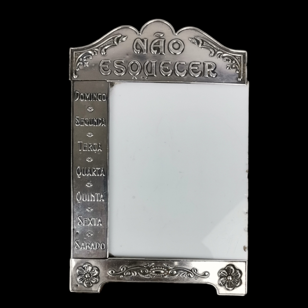 Prata Portuguesa de 833/1000. Marca de contraste do Porto. Javali. Costas em pau santo. Decoração relevada com os dias da semana. Peso (bruto Dim: 16 X 10,5 cm.