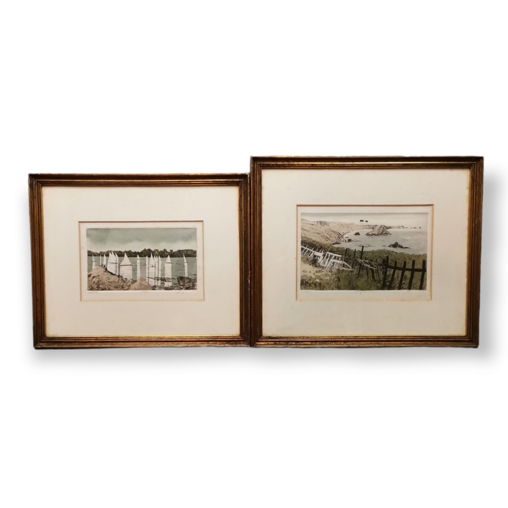 Gravuras coloridas com vista de costa e veleiros. Tiragem 134/200 e 109/200. Molduras douradas e passpartout. Dim (maior): 12 X 20 cm Total com moldura: 30 X 36 cm. Dim (menor): 10 X 17 cm. Total com moldura: 27,5 X 34 cm.