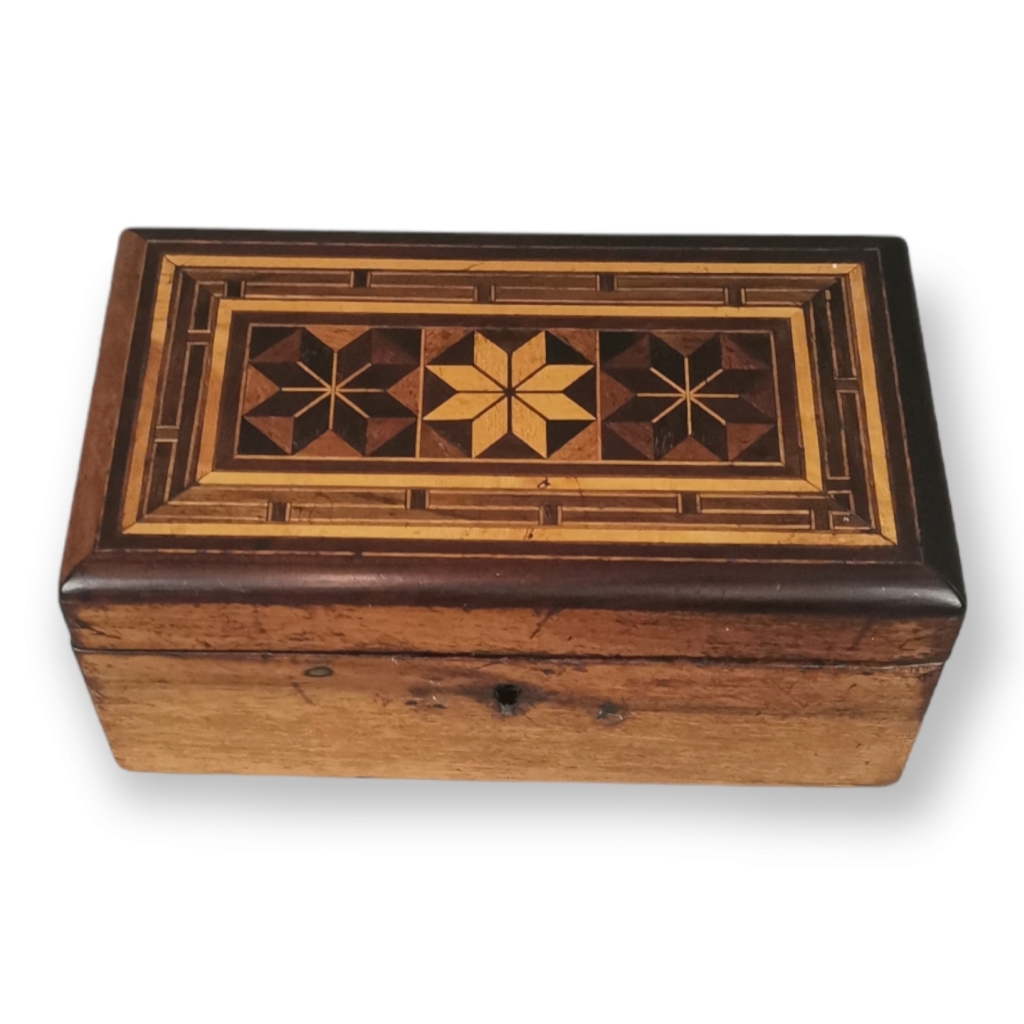 Várias madeiras. Tampa decorada com embutidos geométricos . Trabalho da Ilha da Madeira. Interior com divisórias. Sinais de uso. Dim: 6,5 X 17 X 10 cm.