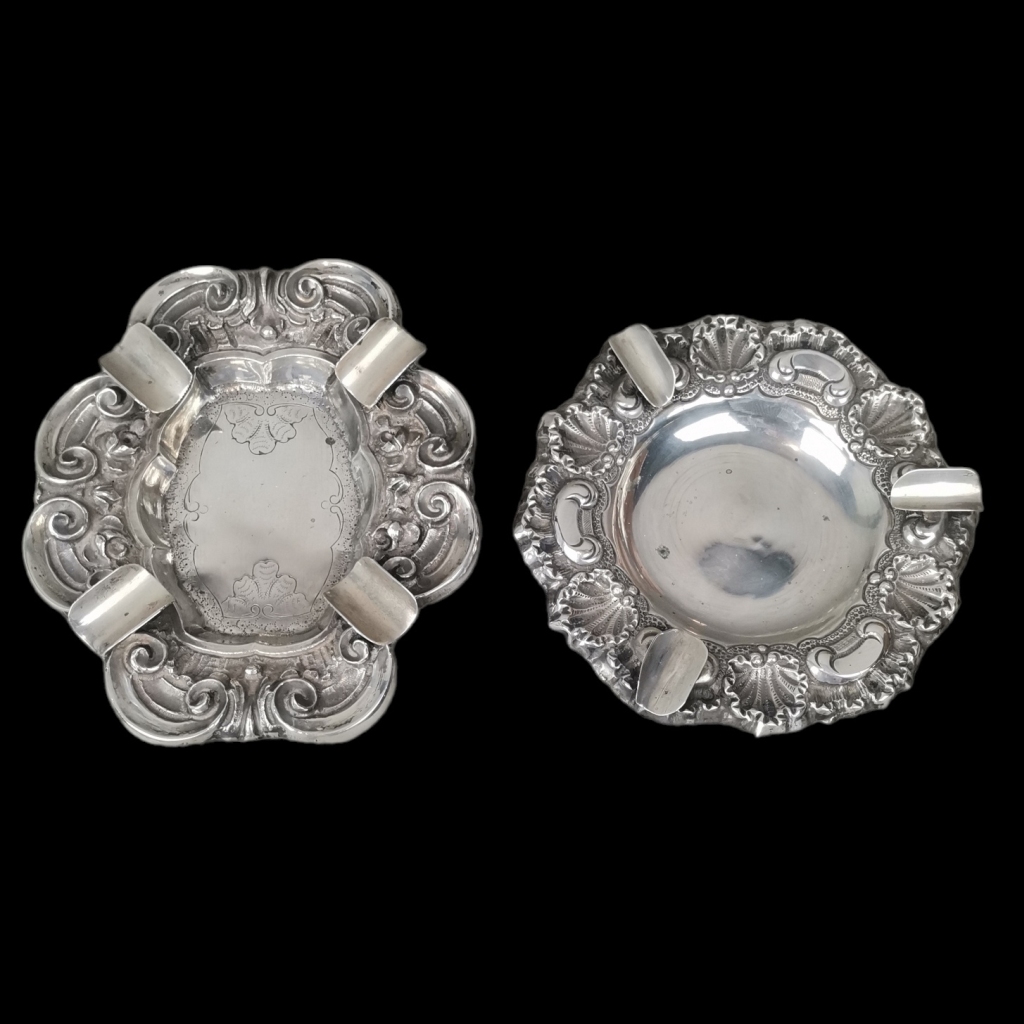 Decoração relevada com concheados e flores. Um em prata Portuguesa de 833/1000. Marca de contraste do Porto, Águia. Outro sem marcas, ao abrigo do Decreto-Lei 120/2017, de 15 de Setembro - art. 2º, n.º 2, alínea c). Peso: 196 grs.