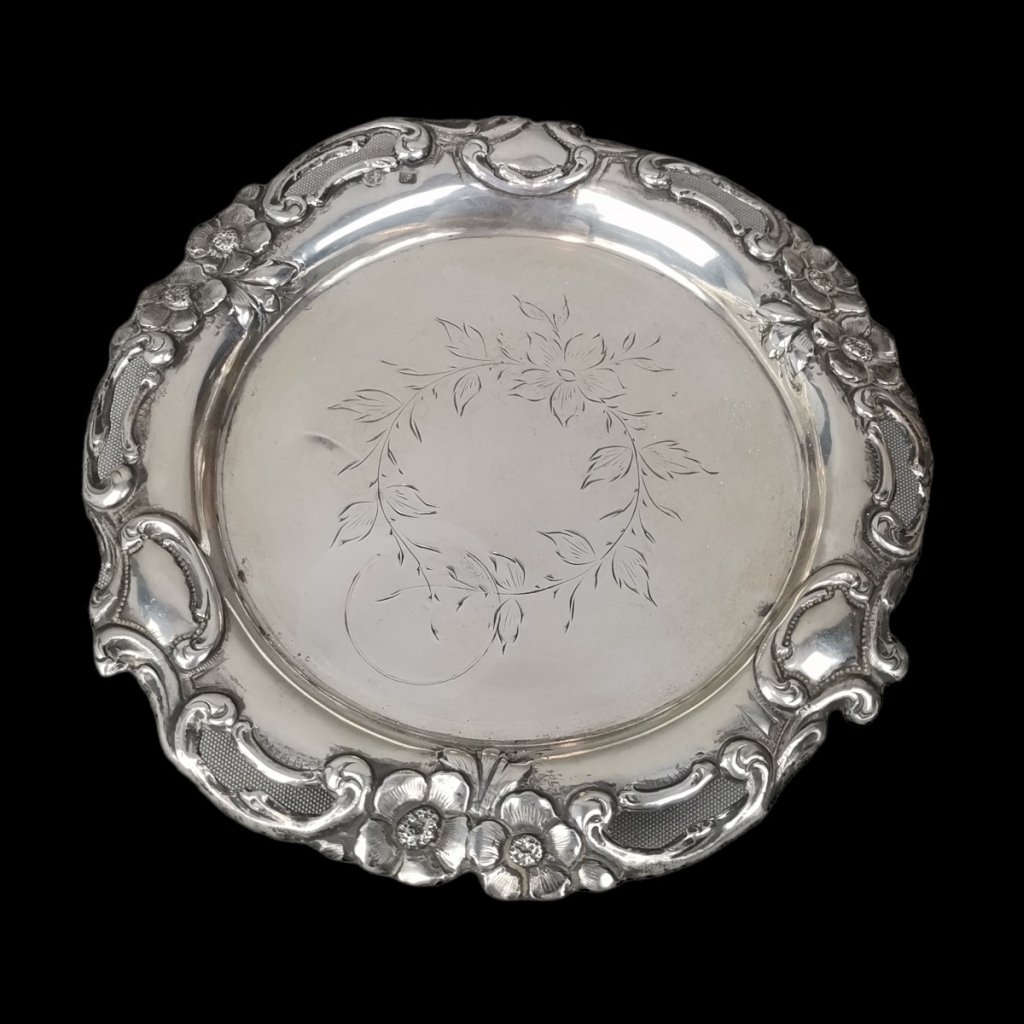 Prata Portuguesa de 833/1000. Marca de contraste do Porto, Javali. Decoração floral relevada e transfurada. Assente em 3 pés. Peso: 72 grs. Sinais de uso. Dim: 14,5 cm