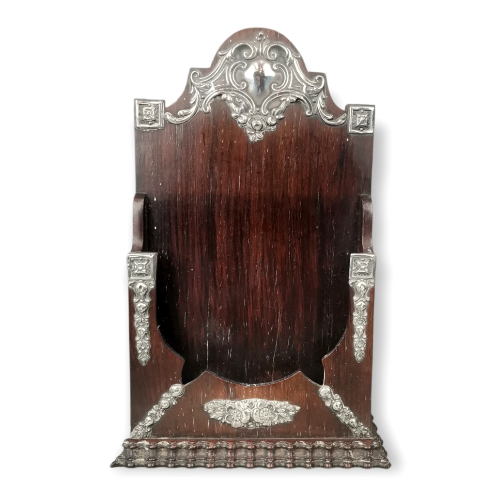 Pau santo com aplicações em prata. Sem marcas, ao abrigo do Decreto-Lei 120/2017, de 15 de Setembro - art. 2º, n.º 2, alínea c). Falta na base. Peso bruto: 225 grs. Dim: 22 X 14 cm.