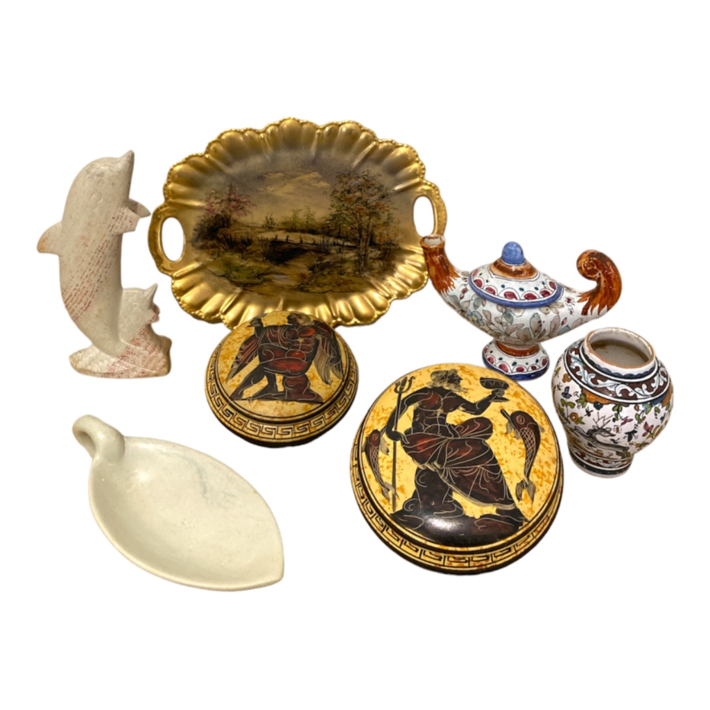 golfinho e covilhete em pedra dura, duas caixinhas com tampa em cerâmica, decoradas com figuras mitologicas, jarrinha e lamparina em cerâmica e covilhete em porcelana decorado com paisagem policromada e ouro. Gofinho e lamparina com falhas. Dim. Covilhete19,5 x 25,5 cm.