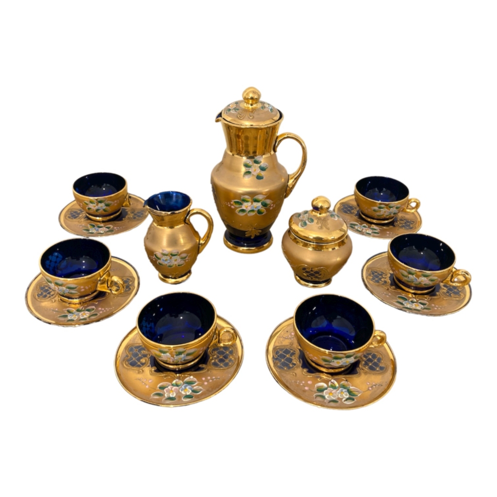 em vidro decorado a ouro com flores policromadas. Cafeteira, Açucareiro, leiteira, seis chávenas com pires. Uma chávena sem asa. Alt. Cafeteira. 19 cm.