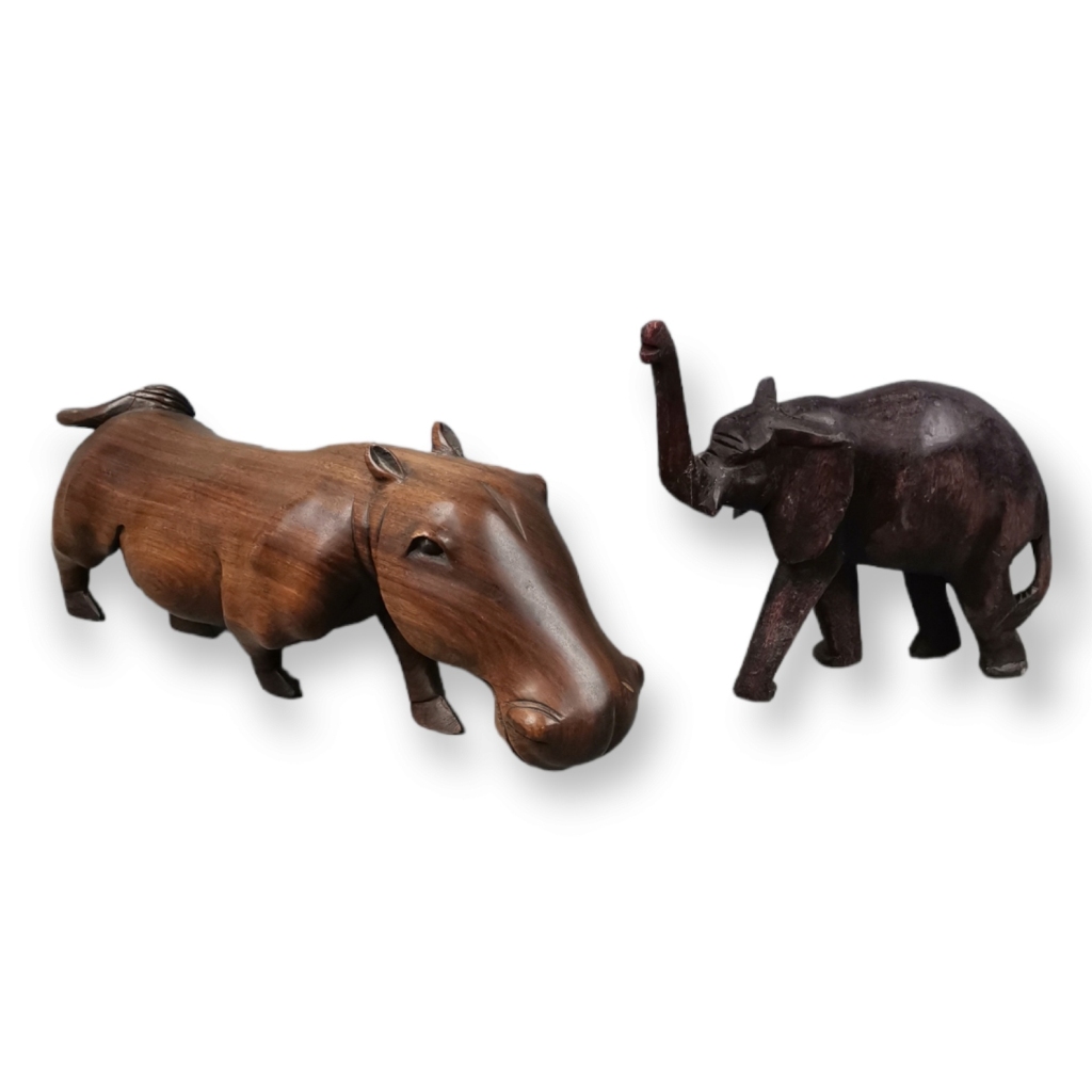 Hipopótamo e elefante. Esculturas em madeira. Elefante com tromba colada.