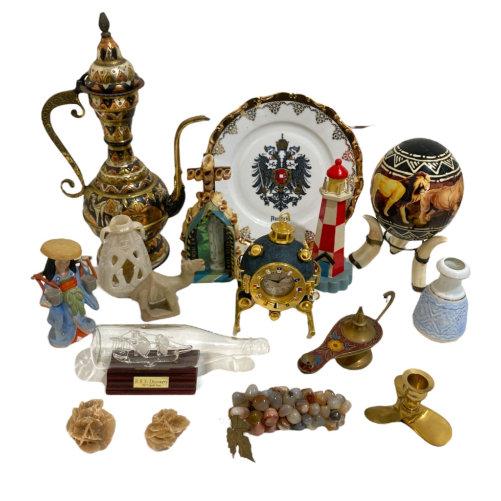 prato e caneca em porcelana, lamparina e castiçal e relógio em metal, cacho de uvas em pedras duras, 2 "rosas do deserto", ovo em material sintético (colagens), jarro em metal. Alt. Do jarro em metal. 40 cm.
