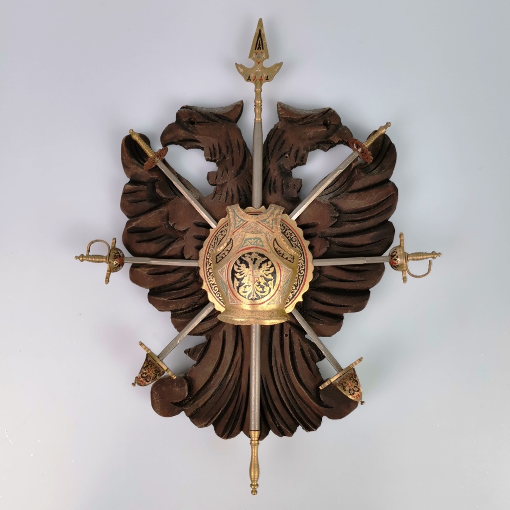 Email € 0 Estrutura em madeira esculpida com águia bicéfala. Armadura e espadas em metal. Fabrico de Toledo.Dim: 23 X 17,5 cm. € 5 € 0 Solicitar informação adicional Voltar a: Leilão 232 - Colecionismo e Oportunidades Estrutura em madeira esculpida com águia bicéfala. Armadura e espadas em metal. Fabrico de Toledo.Dim: 23 X 17,5 cm. € 5 € 0