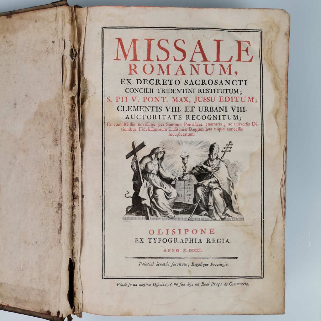 Lisboa. Olisipone. 1801. In 4º. Missale Romanum, ex decreto Sacrosancti Concilii Tridentini Restitutum, S. Pii V. Pont. Max. Jessu Editum. Encadernação da época em pele gravada e fechos em bronze. Anno MDCCCI. Ilustrado.