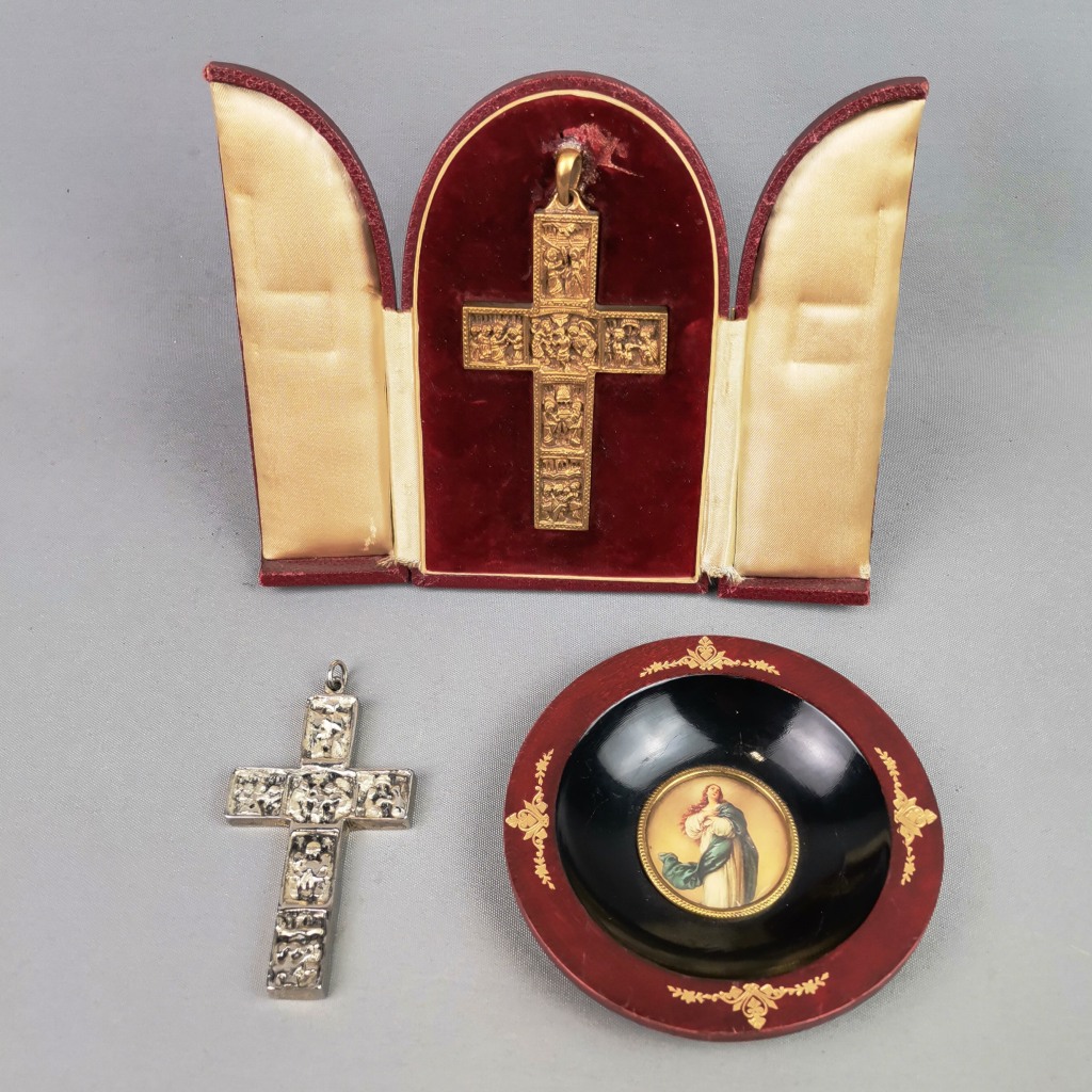 Cruz em bronze dourado. Decoração relevada com cenas da vida de Cristo. Em estojo original marcado Leitão e Irmão. Defeito no estojo. Junta-se Cruz em metal cromado e estampa de Nª Srª em moldura circular. Dim (maior): 14,5 cm.