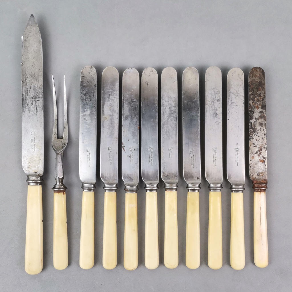 Composto por trinchante de carne e nove facas. Cabos em marfim. Lâminas marcadas Mappin Brothers Sheffield. Oxidação nas lâminas. Peso (bruto): 930 grs. Certificado CITES nº 21PTLX05394C. Dim (maior) 33,5 cm.