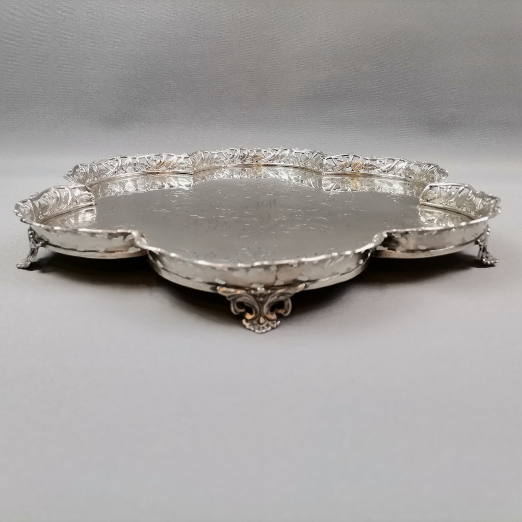 Salva lobolada em prata Portuguesa de 833/1000. Marca de contraste do Porto, Javali II título. Marca de ourives não identificada. Gradinha decorada com pássaros e folhagem. Centro cinzelado com flores e monograma. Peso: 770 grs.