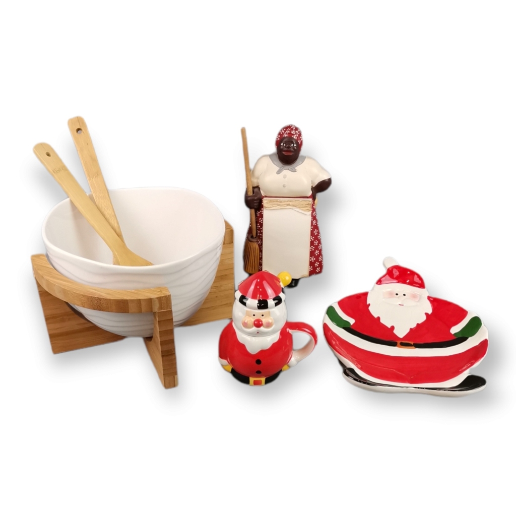Saladeira em porcelana com suporte e talher em bambu, caneca para chá com coador e tampa em forma de Pai Natal, taça em forma de Pai Natal e figura de africana em barro pintado com bloco de notas. Dim (saladeira) 18 X 27 cm.