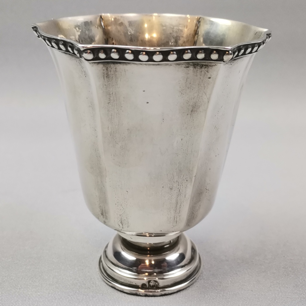 Prata Portuguesa de 833/100. Marca de contraste Águia do Porto. Corpo sextavado assente em pé circular. Perlado no bordo. Com inscrição ISCYRA 1966. Peso 98 grs. Alt: 9,5 cm.