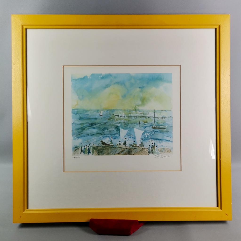 Serigrafia sobre papel, assinada, datada de 1988, série 211/1000, motivo Marinha. Moldura de madeira pintada. Dim: mancha 23 X 26 cm. Dim: moldura 53 X 56 cm.