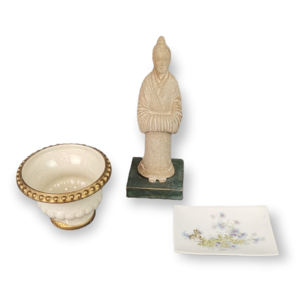 Aneleira em porcelana Europeia decorada com flores, vaso em faiança branca com bordo dourado, com restauro na base e escultura oriental em pedra de sabão assente em base de madeira pintada. Dim (maior): 25 cm.