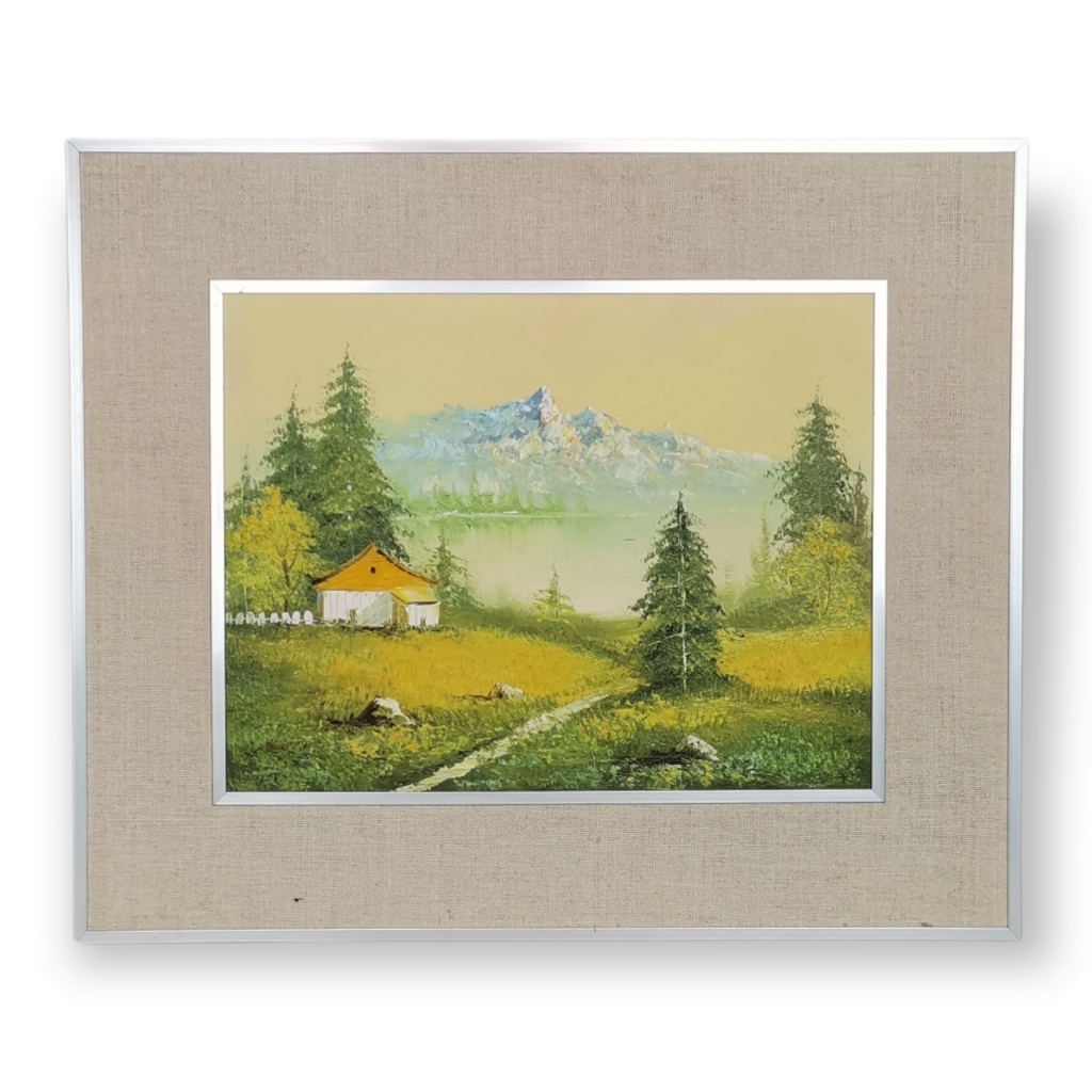 Par de pinturas a óleo s/ platex, paisagens de rio e montanha. Molduras em alumínio e passpartout em tela. Dim: 30,5 X 39,5 cm. Total com moldura: 49 X 58 cm.