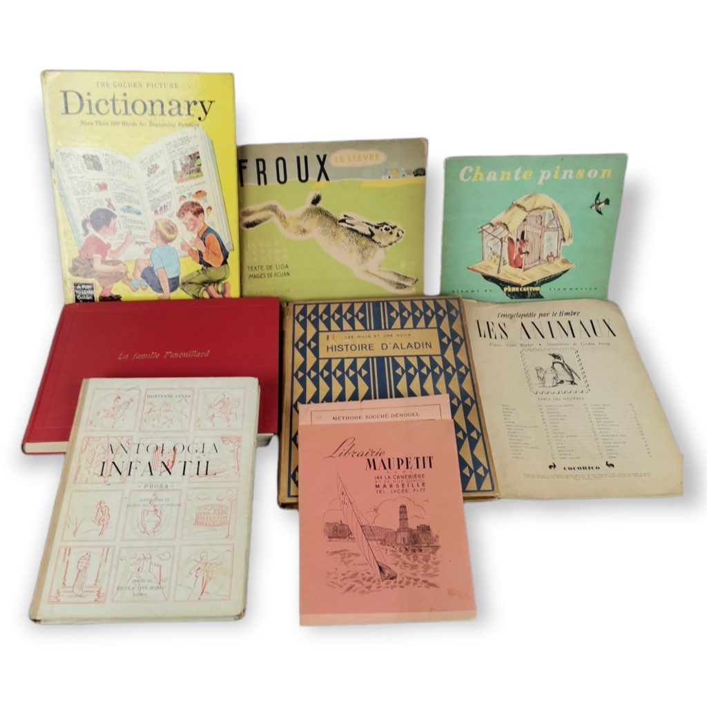 Conjunto de 8 títulos:1- BRAUN . HISTOIRE D'ALADIN ou la Lampe Merveilleuse. 1950. In-fólio de 96 p. Cart. Com riscos a lápis de cores. 2 - CHRISTOPHE. LA FAMILLE FENOUILLARD. Paris, Club du Meilleur Livre, 1957. Reprodução boa da edição original desta