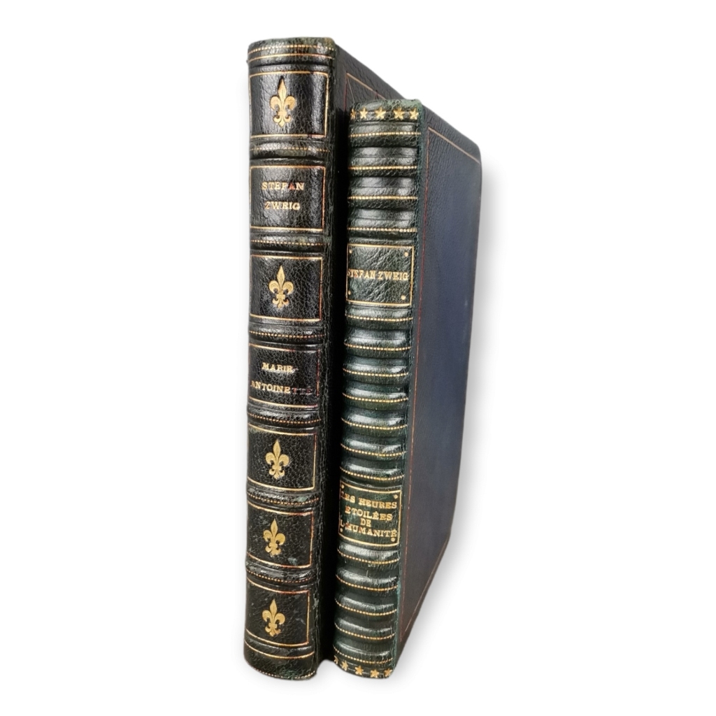 ZWEIG, Stefan. Conj. De 2 vols: 1 - LES HEURES ÉTOILES DE L'HUMANITÉ. Paris, s/d. In-8º 250 p. Encadernação inteira em charin azul, bem dourada. 2 - MARIE ANTOINETTE.1945. In-4º 510 p.Encadernação inteira de chagrin, muito bem dourada nas pastas.