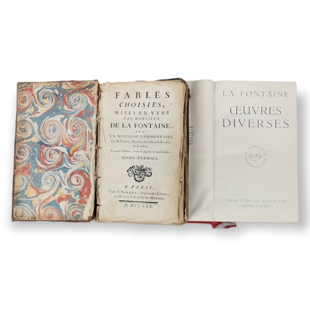 1 - FABLES CHOISIES, mises en vers par, avec un nouveau commentaire par M. Coste… Paris, 1770. In-12º LI-284 p. Enc. Inteira de carneira da época, bastante cansadae a abrir-se. Falta de partes de folhas iniciais, mas com as ilustrações curiosas