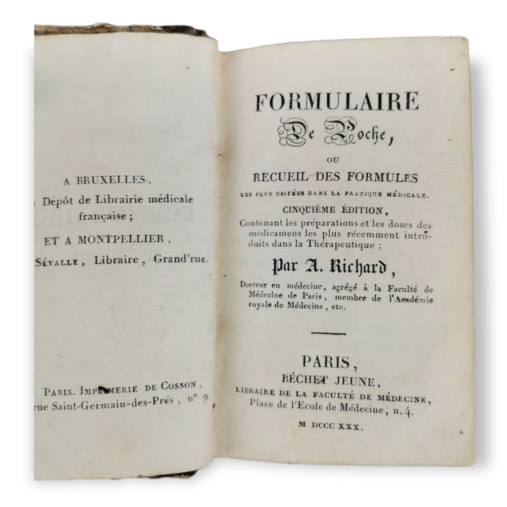 RICHARD, A. FORMULAIRE DE POCHE ou recueil des formules les plus usités dans la pratique medicale. Paris, 1830. In-16º, de 404 p. Meia encadernação em chagrin. Muito invulgar, com as receitas muito à base de plantas. Estes livrinhos são muito raros.