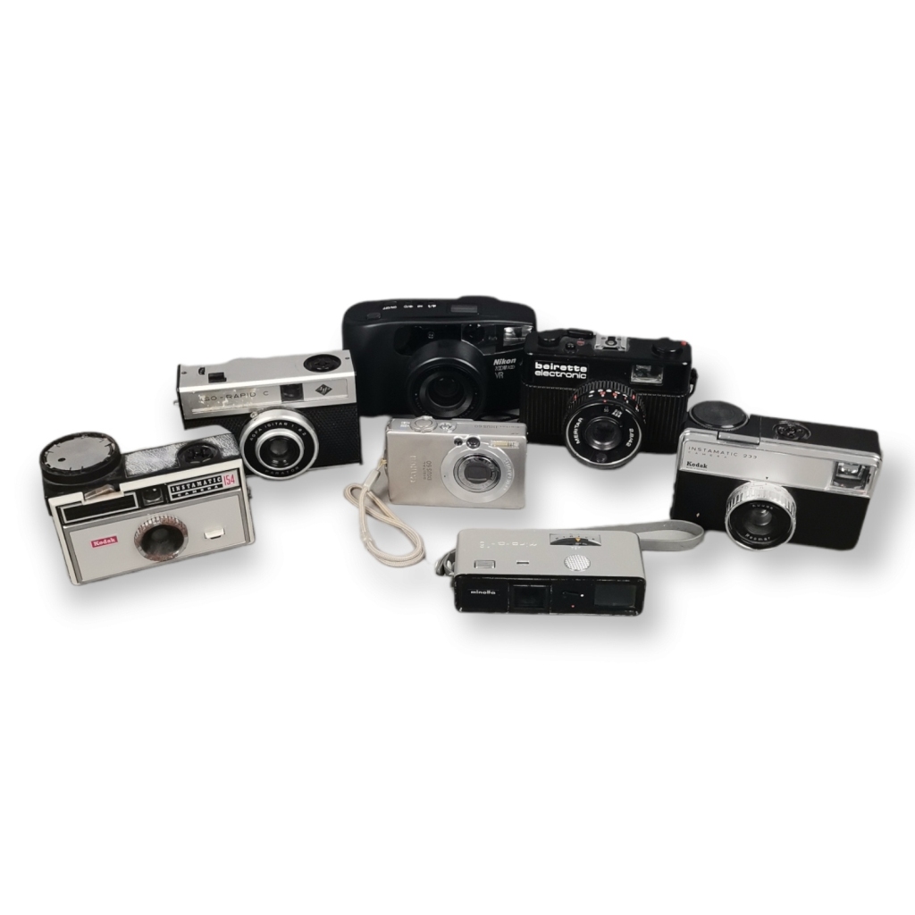 Sete máquinas fotográficas vintage. Uma digital Canon Ixus 60 de 6 Mega pixels, uma Nikon zoom 700 VR, duas Kodak Instamatic modelos 154 e 233, uma Agfa Isso-Rapid, uma Beirette electronic e uma Minolta 16 model P. Sinais de uso e oxidação. Não testadas.
