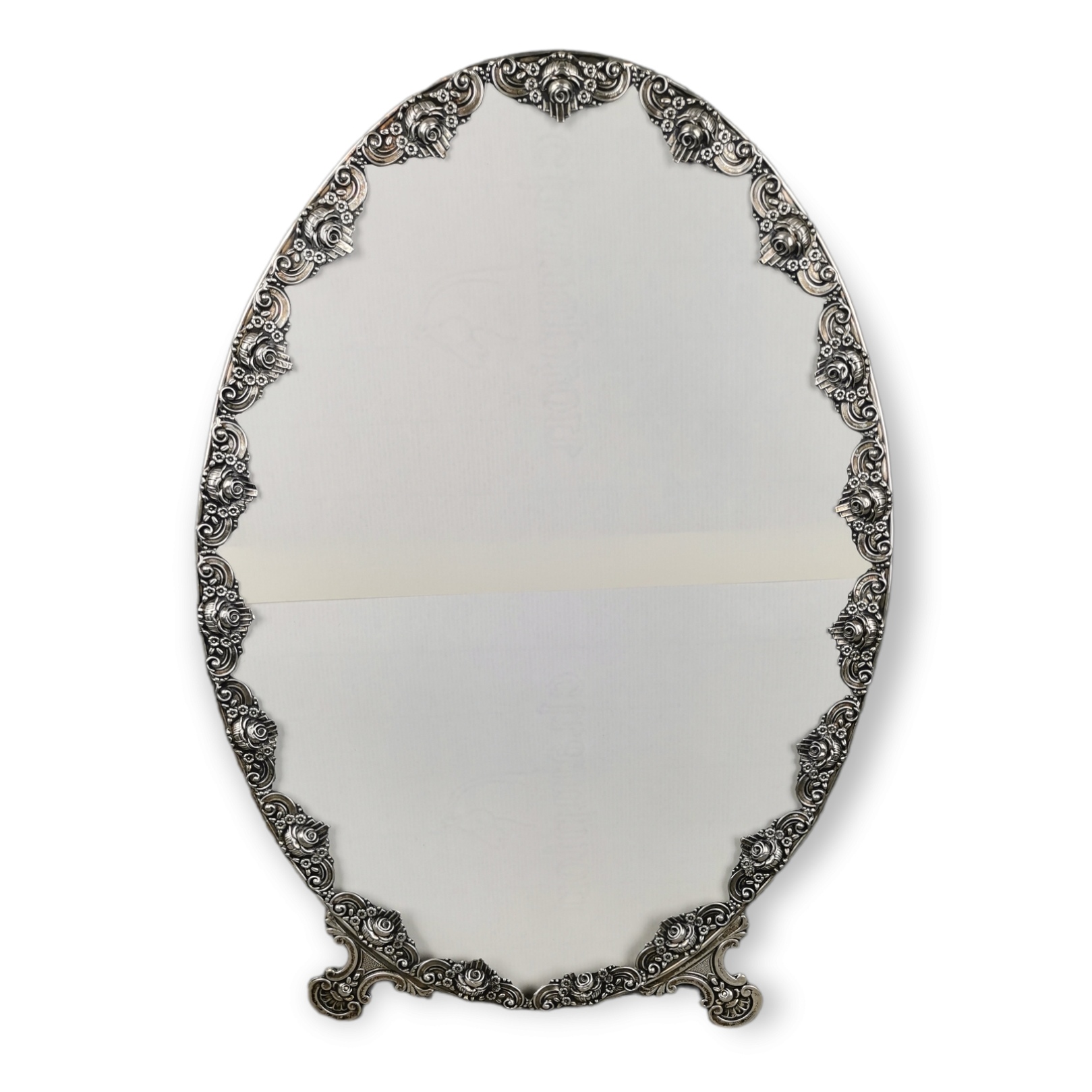 Espelho de mesa oval. Decoração relevada com flores. Prata Portuguesa de 833/1000. Marca de contraste do Porto. Águia. Sem chapa de espelho. Peso (só prata): 100 grs Dim: 38 X 26,5 cm.