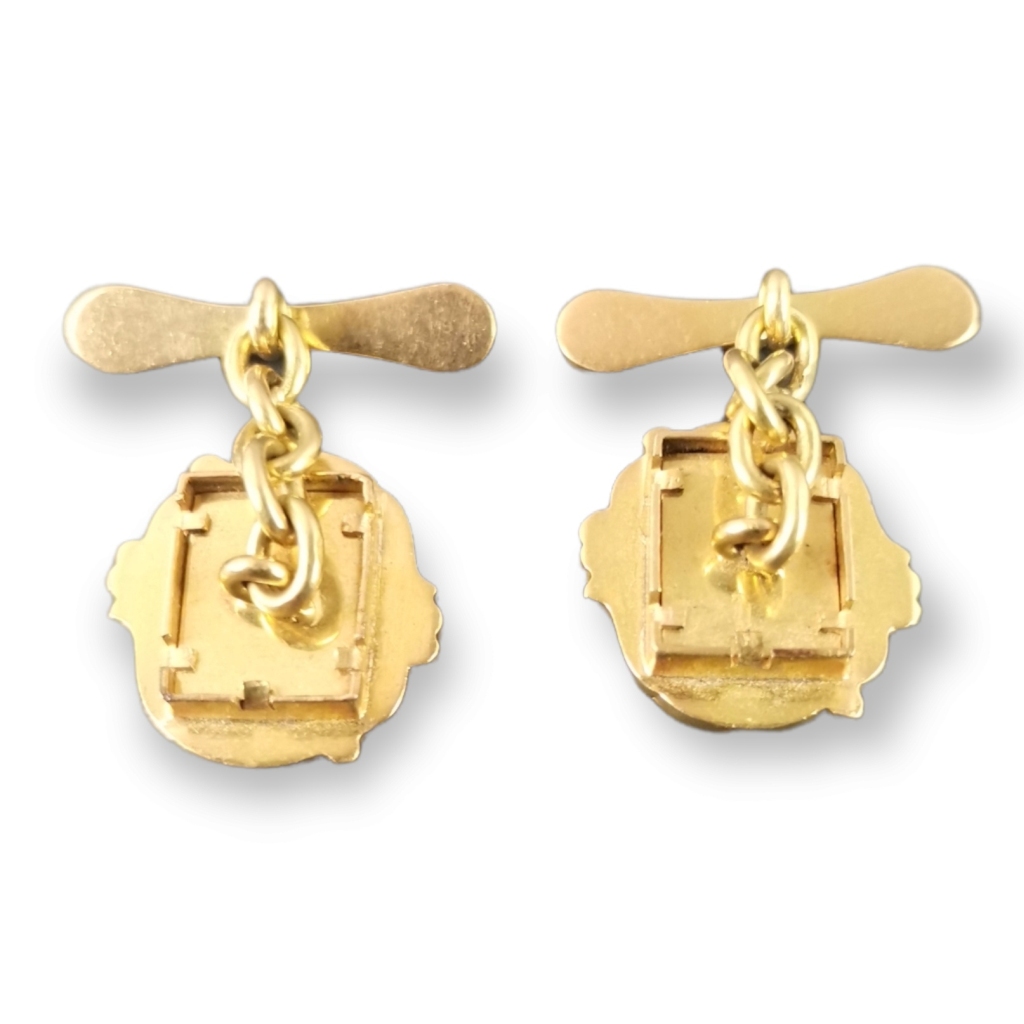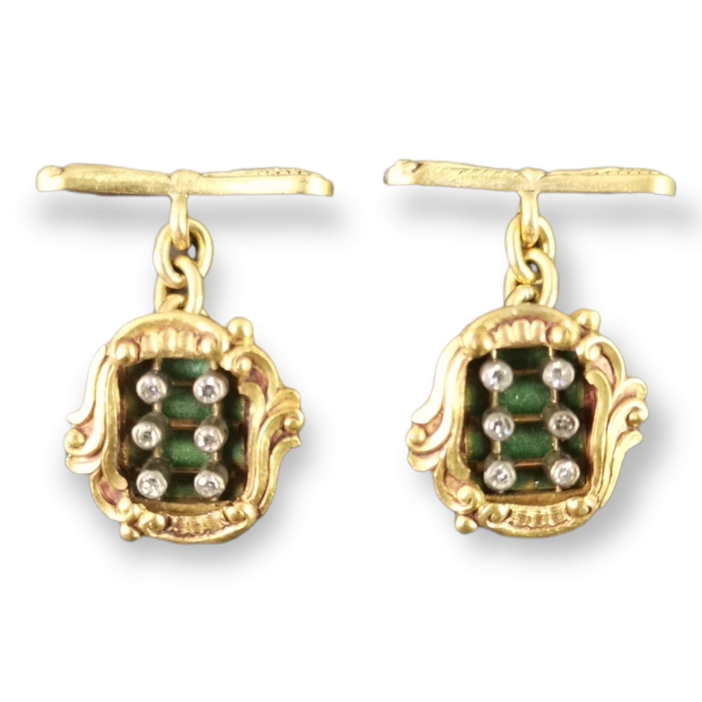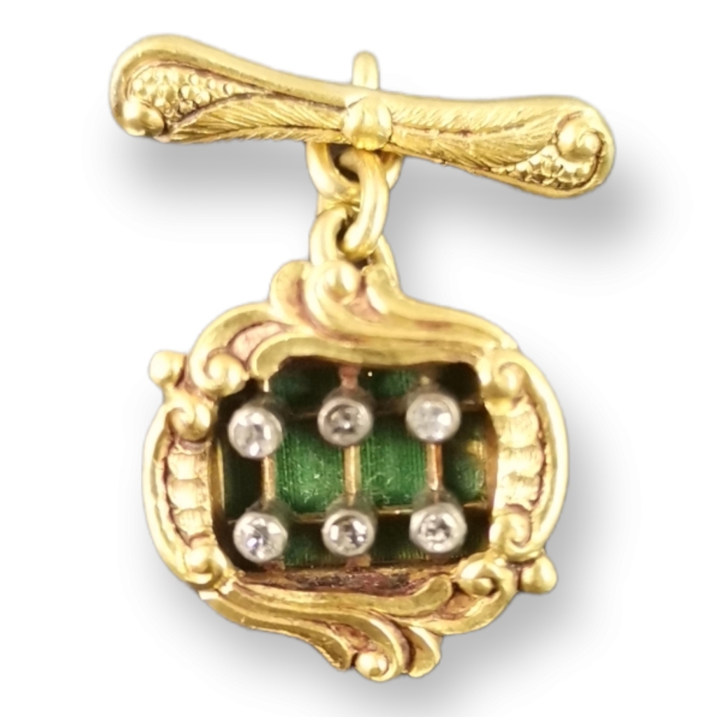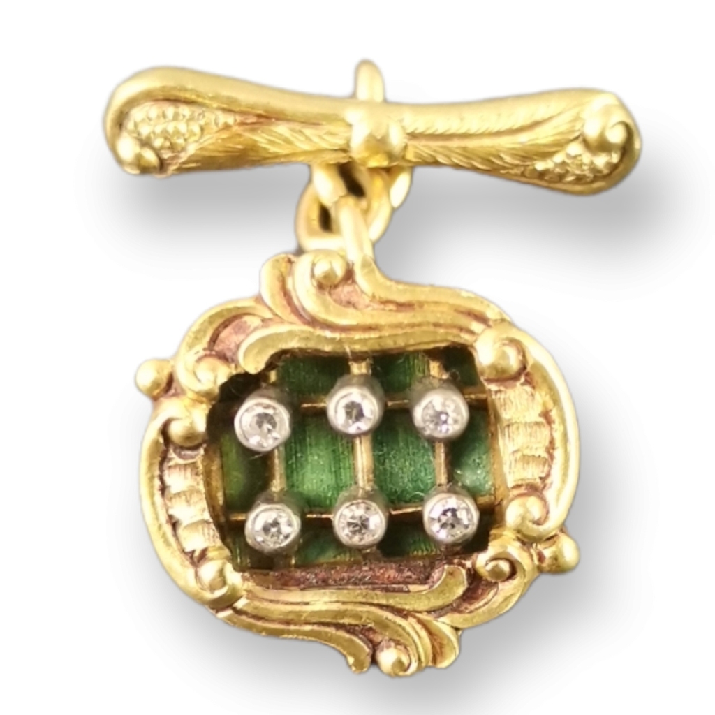 Ouro de 800/1000 e prata. Fundo em esmalte e cravejados com seis diamantes talhe brilhante, cada. Sem marcas, ao abrigo do Decreto-Lei 120/2017, de 15 de Setembro - art. 2º, n.º 2, alínea c). Peso 11,2 grs. Dim.1,5 cm.