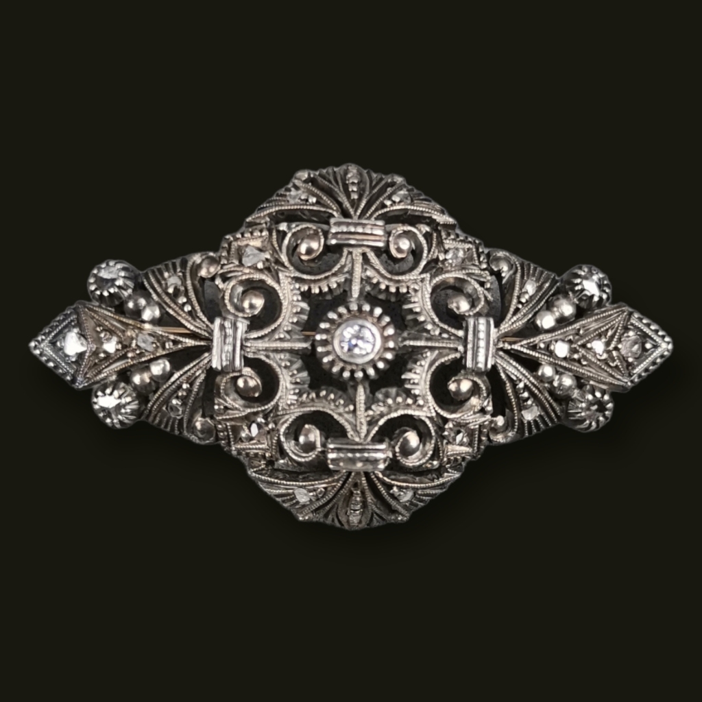Principio do séc XX. Ouro e prata cravejado com brilhante ao centro e diamantes. Peso: 9,50 grs. Marcas de contraste do Porto Ouro de 800/1000 e prata de 835/1000.