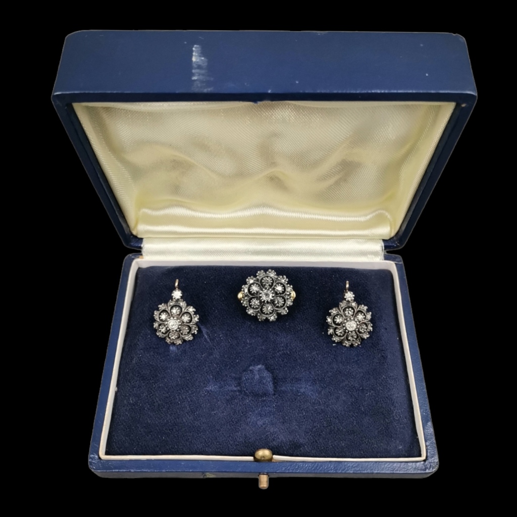 Par de brincos e anel em ouro e prata cravejados de diamantes talhe brilhante. Marcas de contraste do Porto. Ouro 800/1000 e prata de 835/1000. Peso total 13,47 grs.