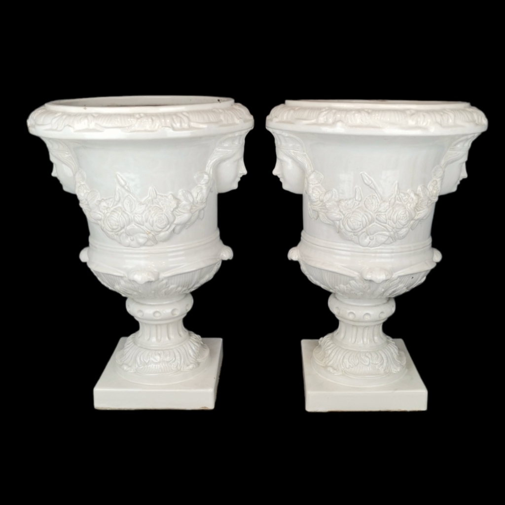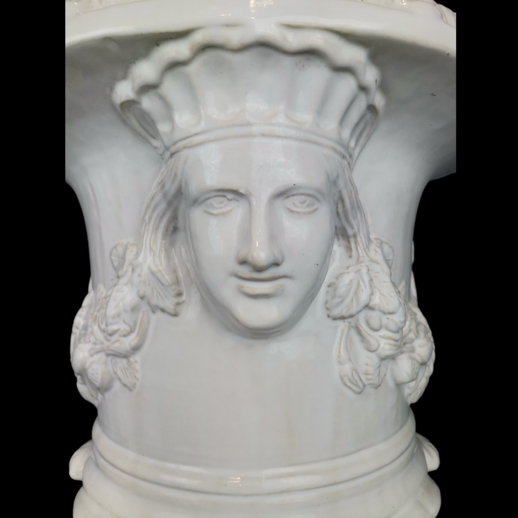Faiança moldada monocromática da fábrica Viúva Lamego. Decoração relevada vegetalista e carrancas laterais. Um marcado na base. Pequenas falhas no vidrado. Dim: 59 X 40 cm.