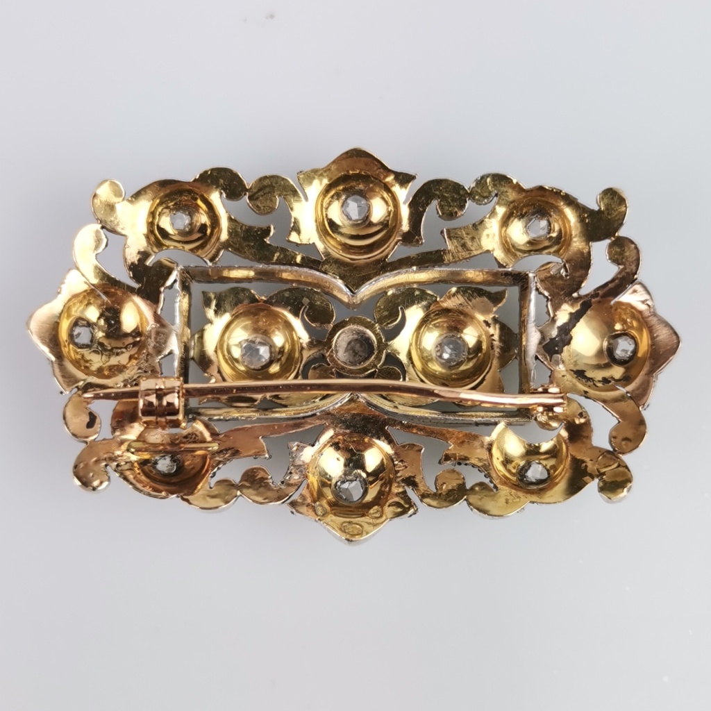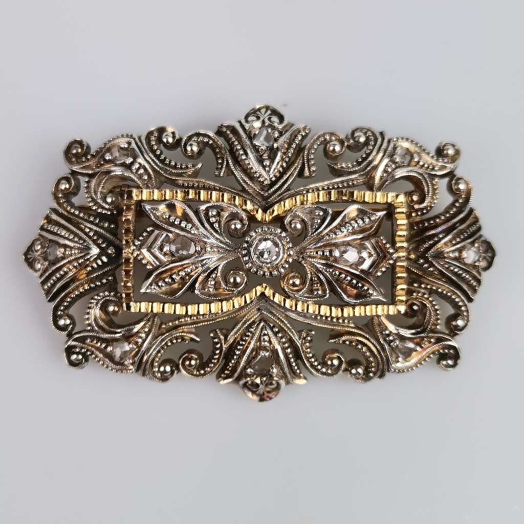 Prata e ouro, cravejado de diamantes. Sem marcas, ao abrigo do Decreto-Lei 120/2017, de 15 de Setembro - art. 2º, n.º 2, alínea c). Peso 10,68 grs. Dim: 4,3 X 2,8 cm.
