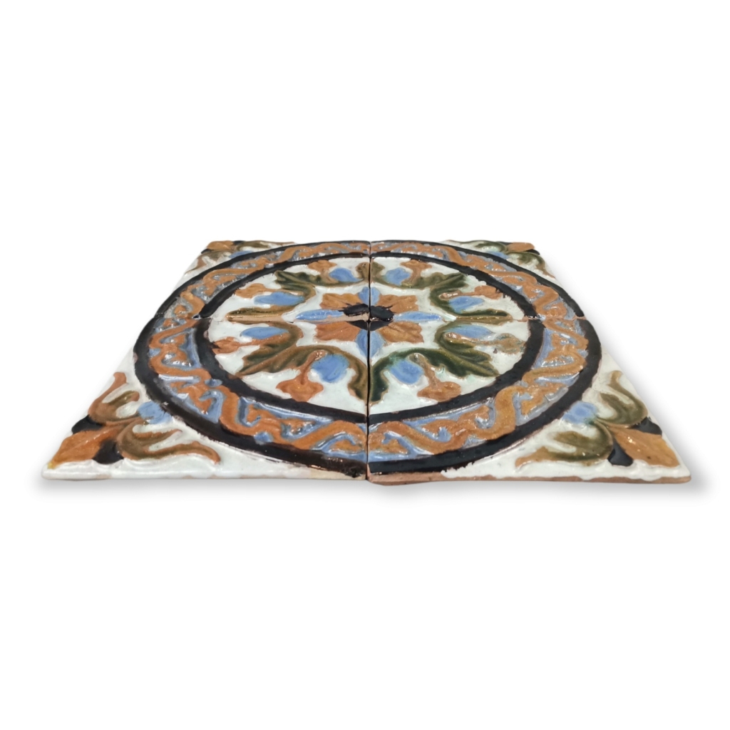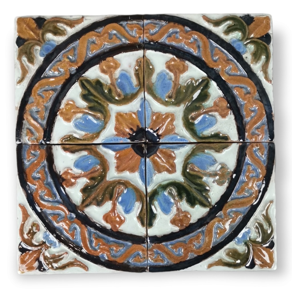 Fábrica de Faianças das Caldas da Rainha Bordalo Pinheiro. Padrão Renascença. Decoração relevada, reproduzindo um padrão Hispano-Mourisco da 1ª metade do séc XVI. Princípio do séc XX. Dim 13 X 13 cm (cada)