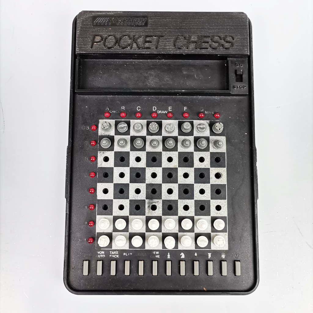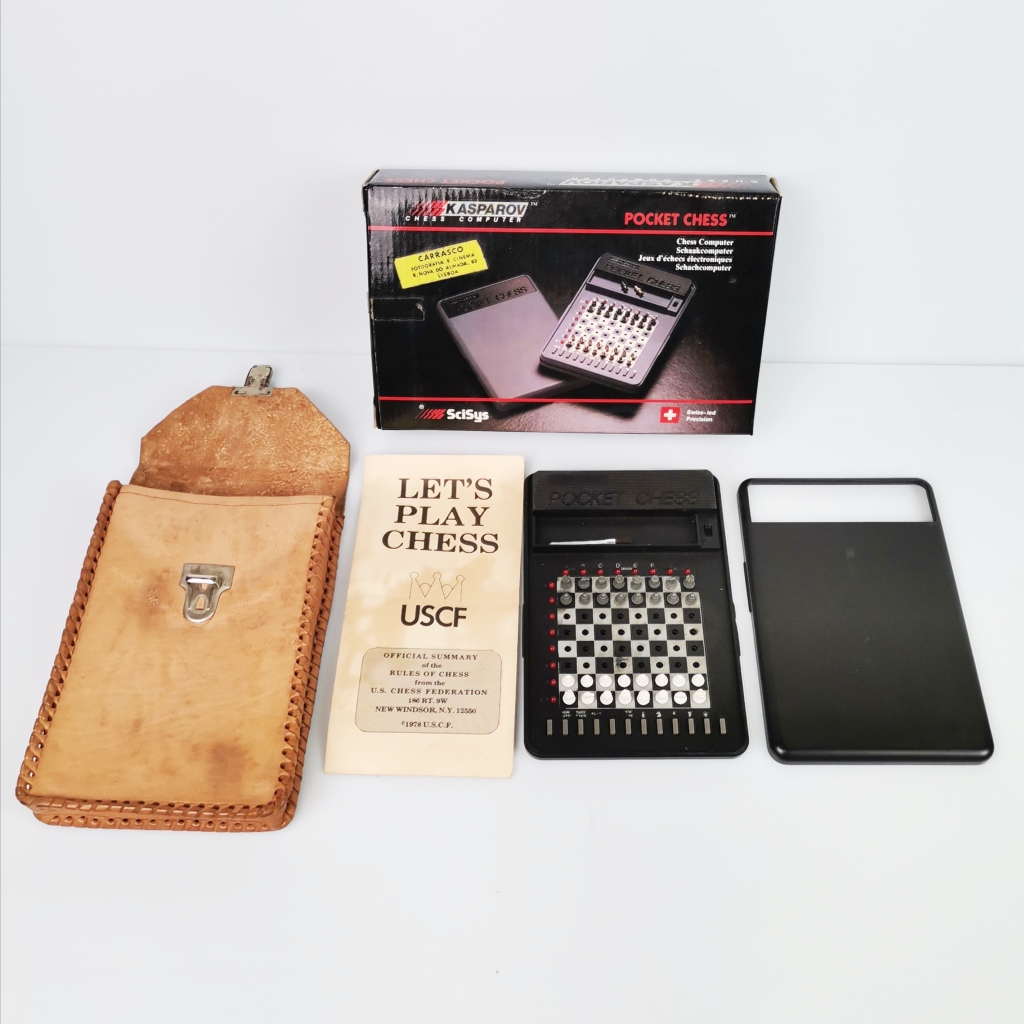 Kasparov Chess Computer. Jogo de xadrez electrónico. Na caixa de origem, com bolsa em pele original e manual de instruções.. Em funcionamento. Dim: 20 X 13 cm.