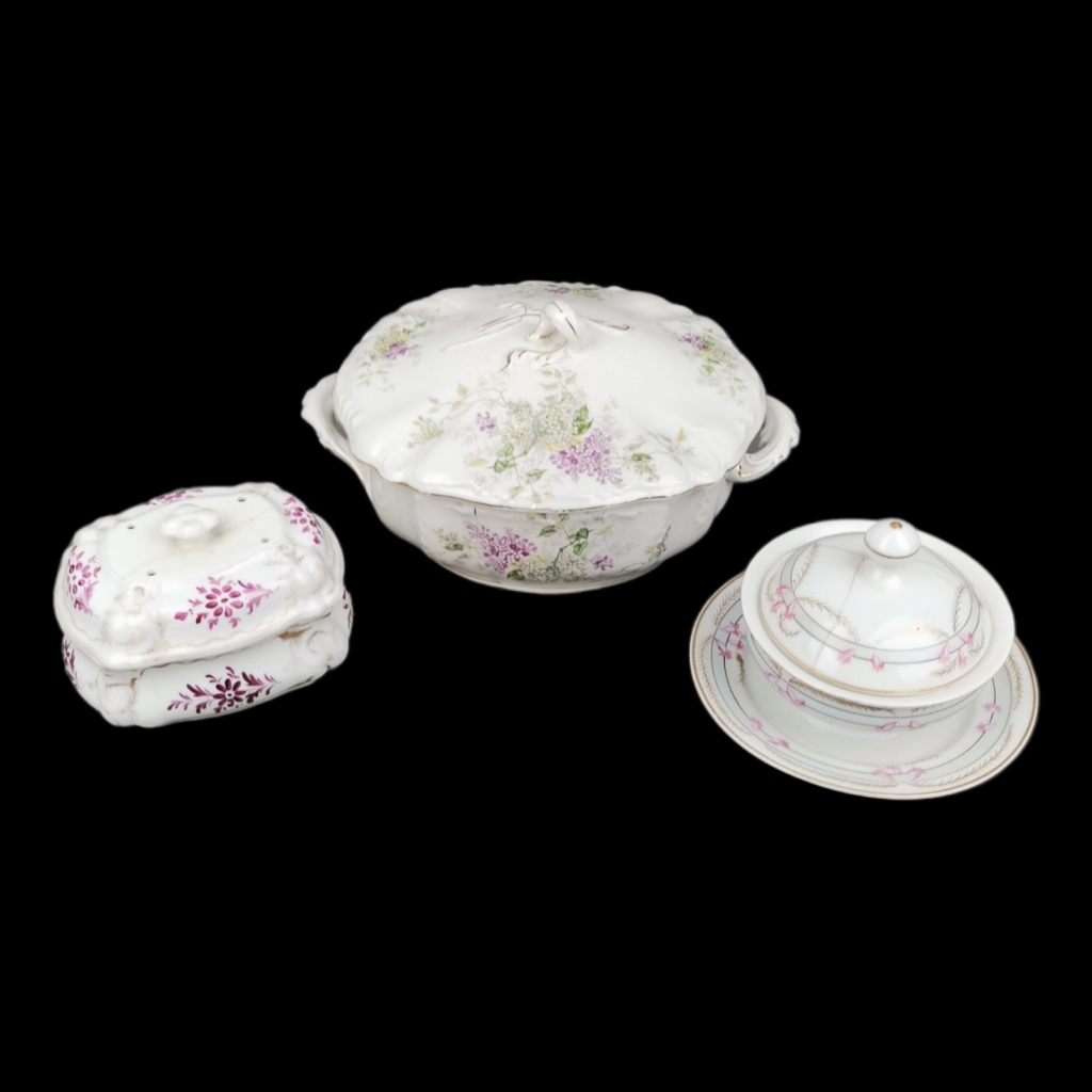 Terrina porcelana Europeia com decoração floral com cabelo no corpo, saboneteira em porcelana moldada com cabelo na tampa e manteigueira em porcelana Vista Alegre com a tampa colada, marca nº 11 VA azul (1852-1869) Dim (maior): 27 cm.