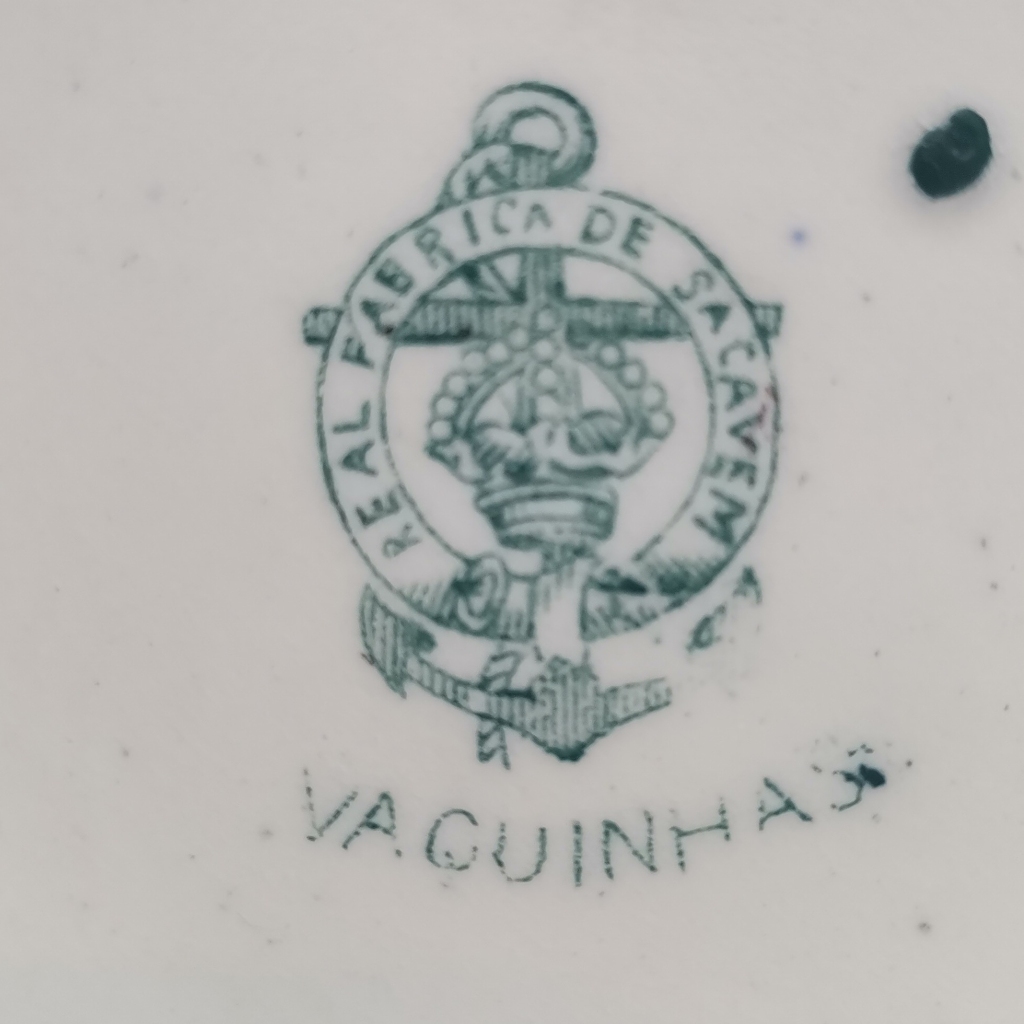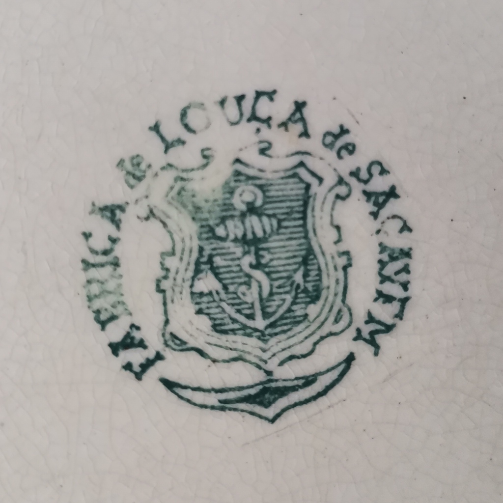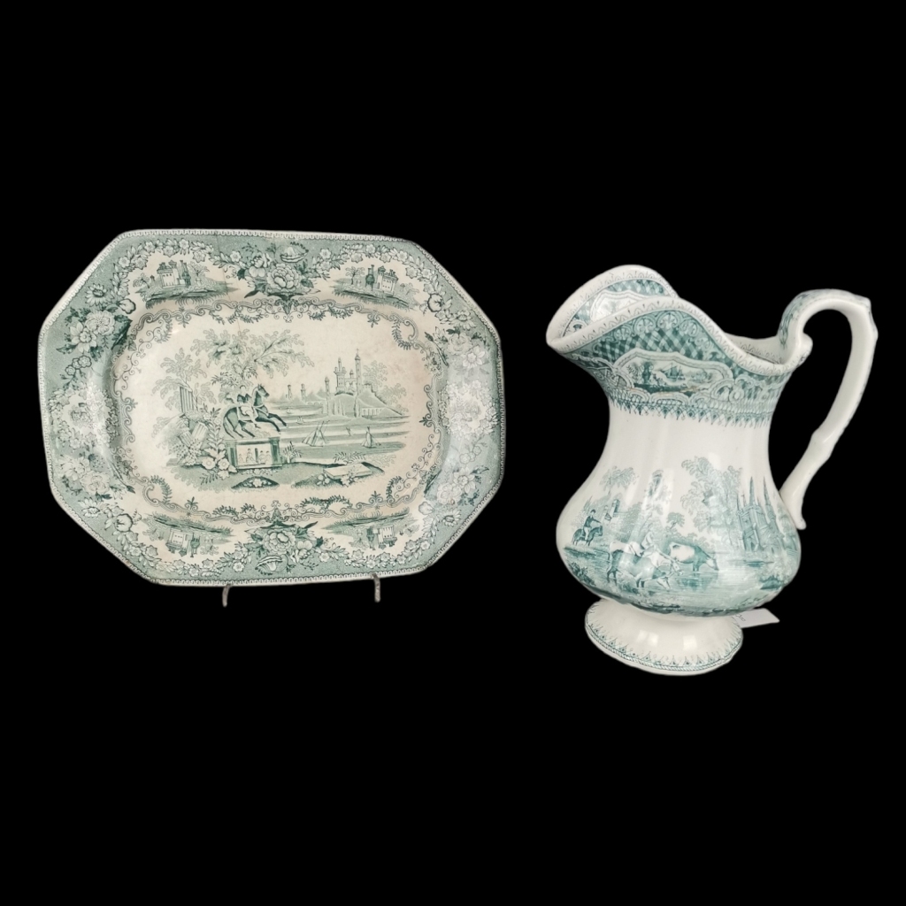Faiança da fábrica de Loiça de Sacavém. A travessa com decoração Estátua e o jarro com decoração Vaquinhas. Travessa com cabelo e jarro com colagem. Marcas do séc XIX. Dim (travessa): 34,5 X 26,5 cm. (jarro): 26 cm.