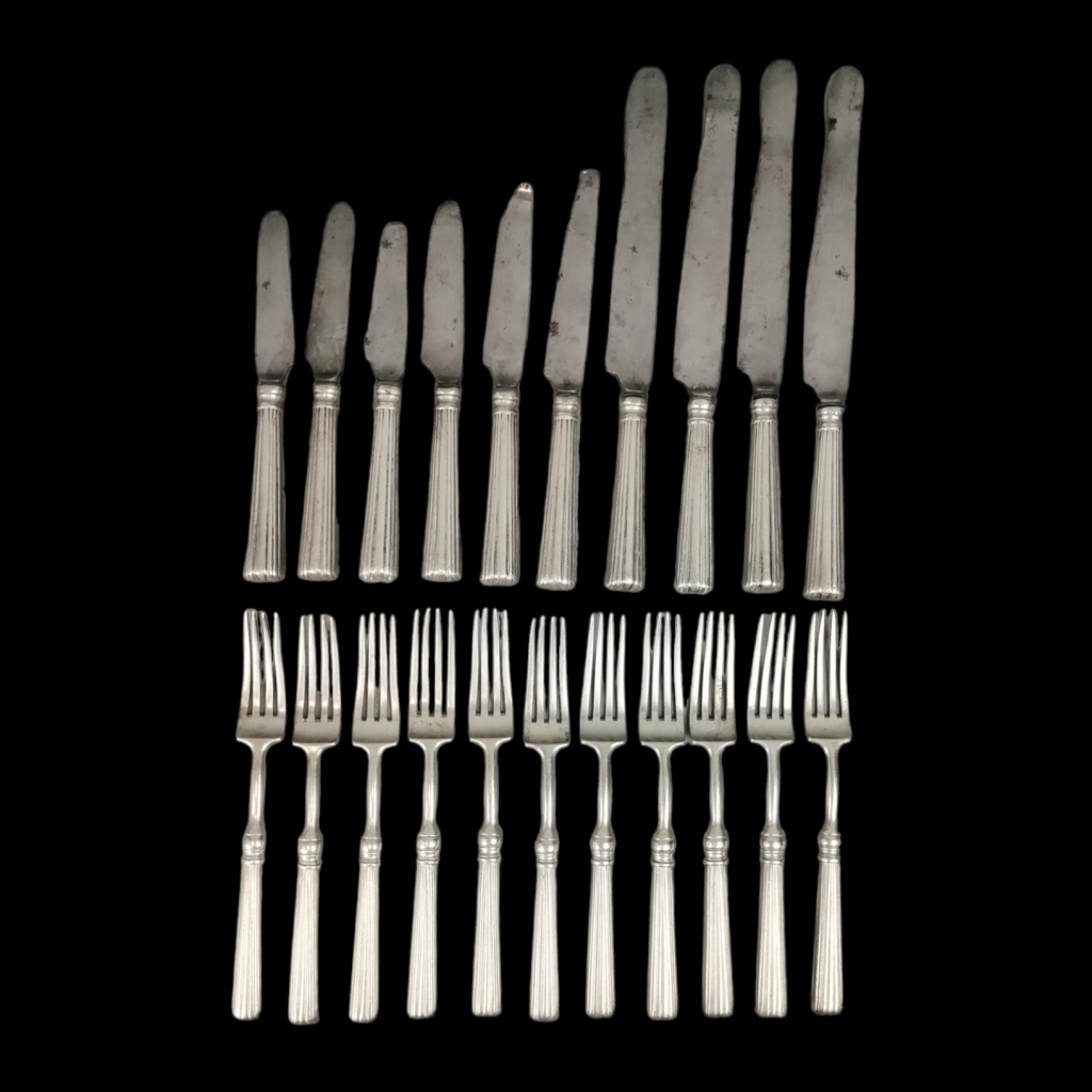 Prata Portuguesa de 833/1000. Marca de contraste do Porto. Águia (1938-1984). Onze garfos e dez facas modelo "meia cana". Facas com lâminas de tamanhos diferentes, embora os cabos sejam iguais. Algumas peças sem marcas de contraste.Peso total 1415 grs